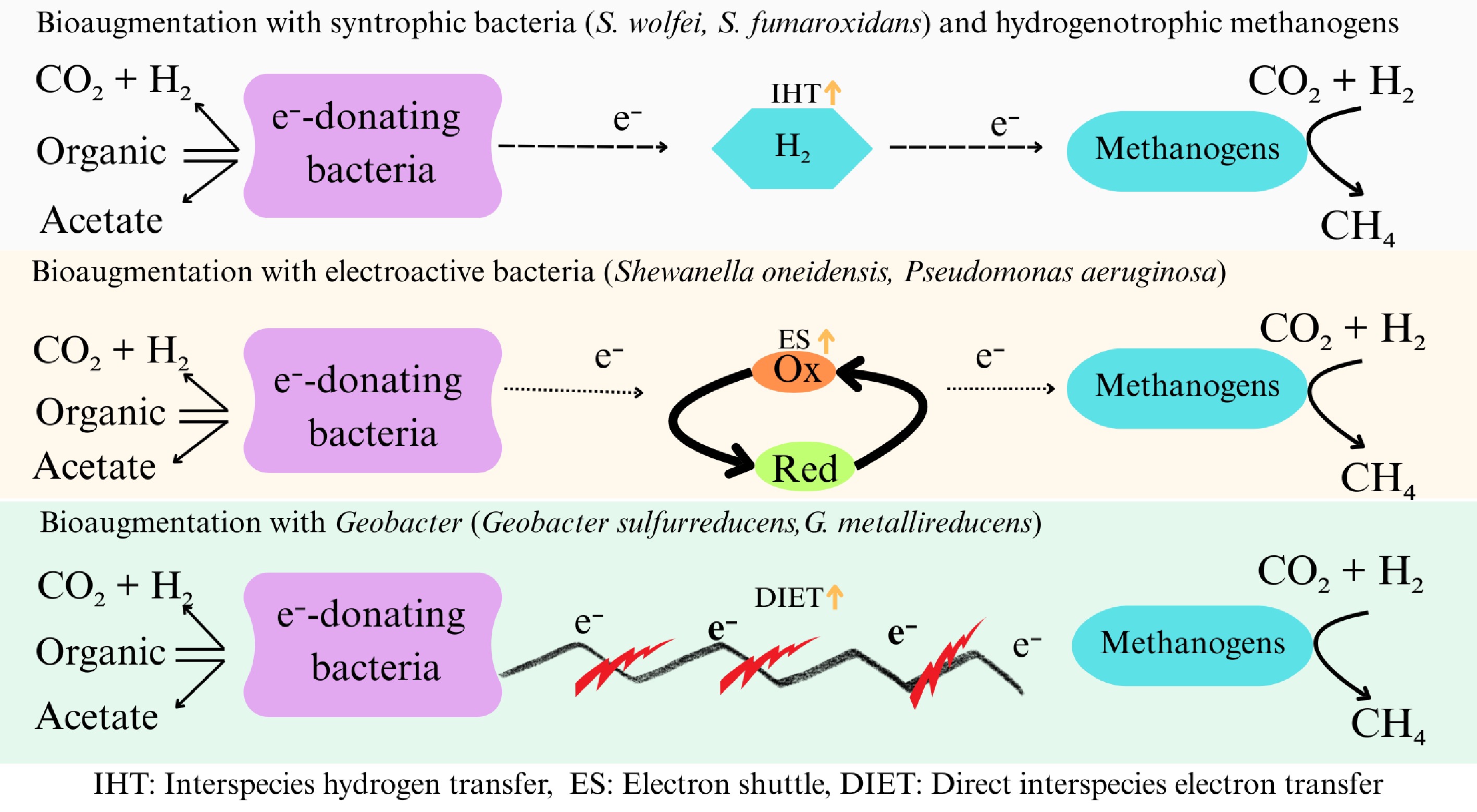 Role of bioaugmented bacteria in enhancing methanogenesis for alleviation of ammonia inhibition. Inoculation with suitable strains could enable electron transfer between the syntrophic partners resulting in enhanced methanogenesis while mitigating impacts of ammonia accumulation. (This figure was produced using input from references[78,79]).