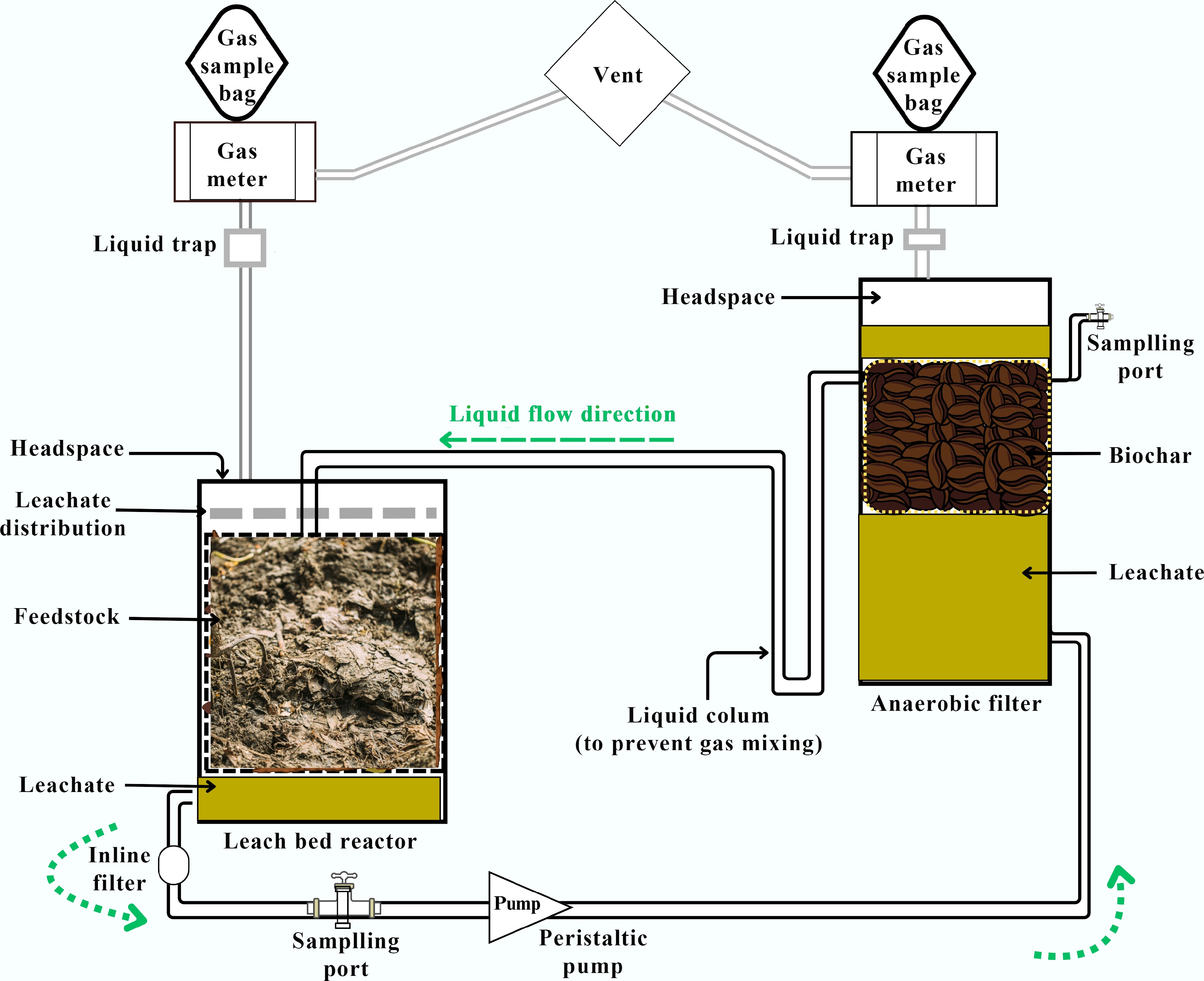 Schematic representation of a leach bed reactor. A leach bed is coupled to a biochar filter for anaerobic digestion of nitrogen-rich wastes. (The figure was adapted from reference[81]).