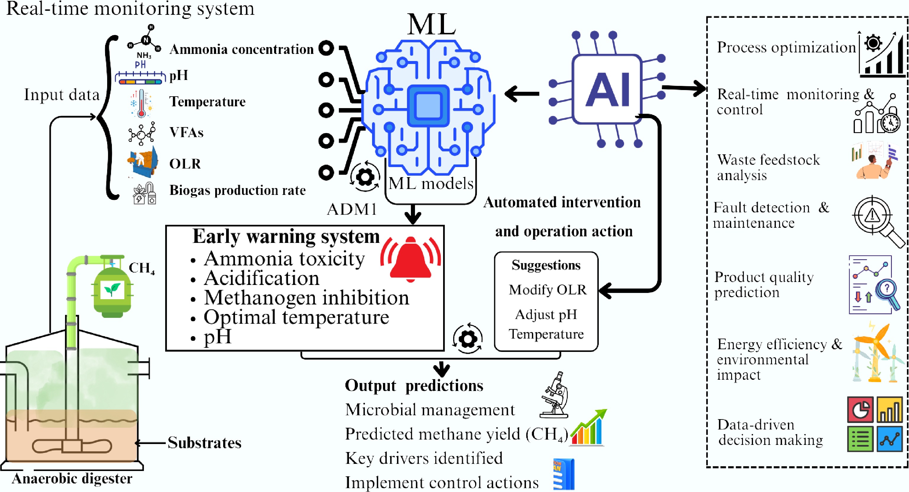 Schematic representation of the application of ML and AI for enhanced methane yield while monitoring and preventing system inhibition resulting from ammonia accumulation.