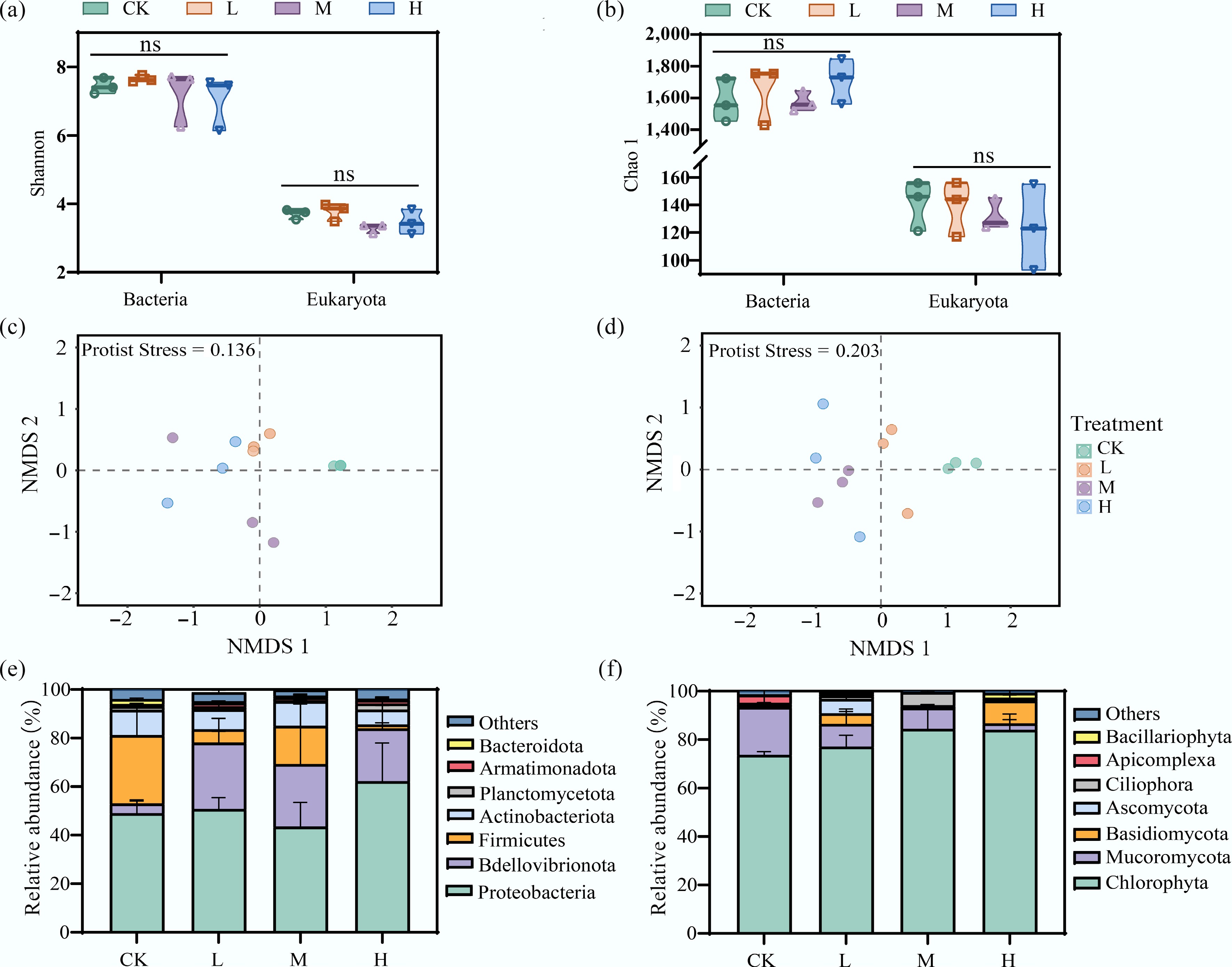 HAP alters the community structure but not the alpha diversity of periphyton. (a), (b) Alpha diversity indices (Shannon and Chao1) of bacterial and eukaryotic communities across treatments. 'ns' indicates no significant difference. Non-metric multidimensional scaling (NMDS) ordination showing changes in the (c) overall bacterial, and (d) eukaryotic community structure. Relative abundance of dominant (e) bacterial, and (f) eukaryotic phyla.