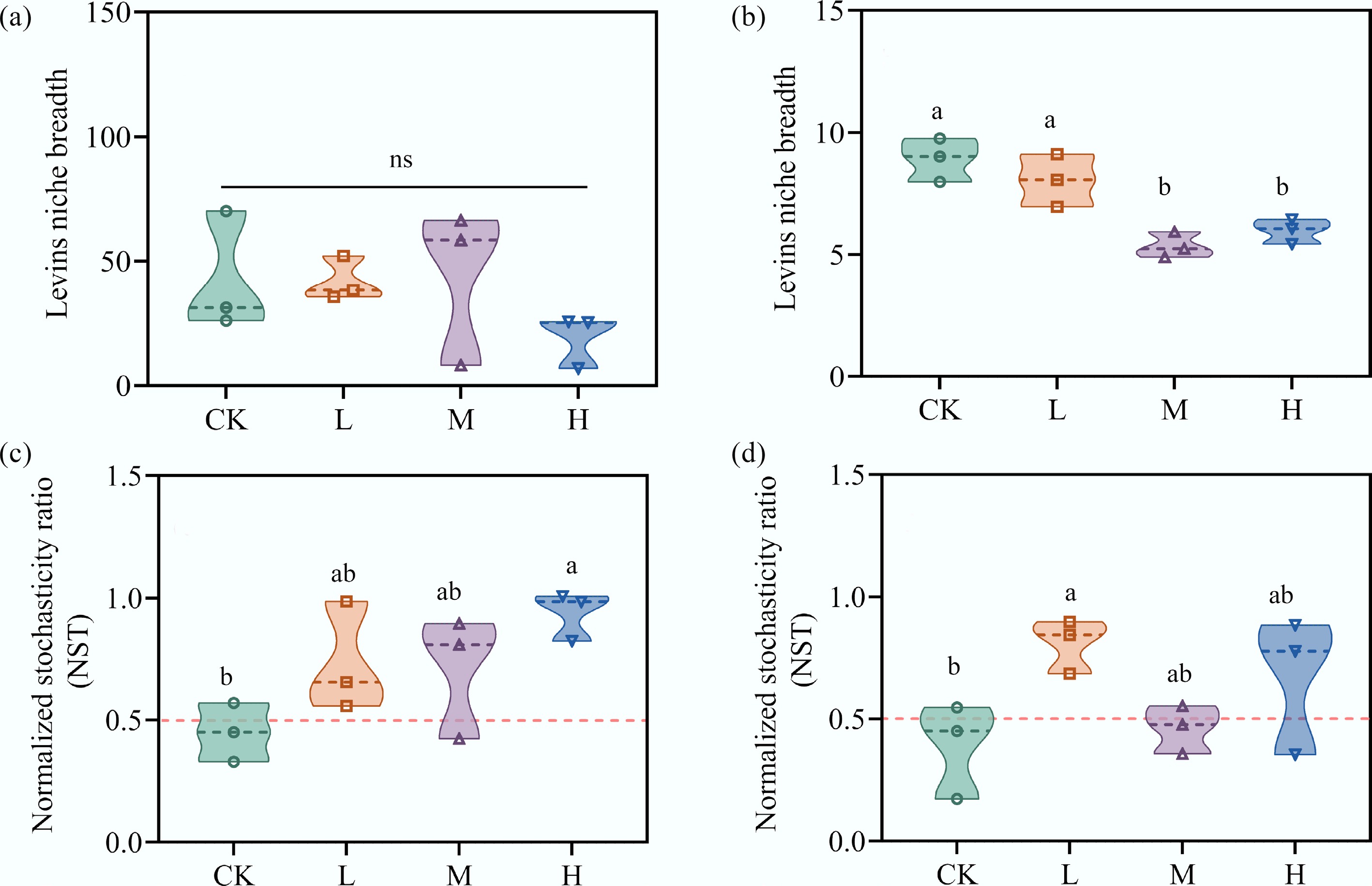 The normalized stochasticity ratio (NST) was used to estimate the relative importance of stochastic processes in community assembly. The NST value for each treatment was computed with the 'NST' package[27]. An NST value of 0.5 served as the threshold to distinguish between more deterministic (< 0.5), and more stochastic (> 0.5) assembly processes. Niche breadth was measured using Levins' index, implemented via the 'spaa' package[28].