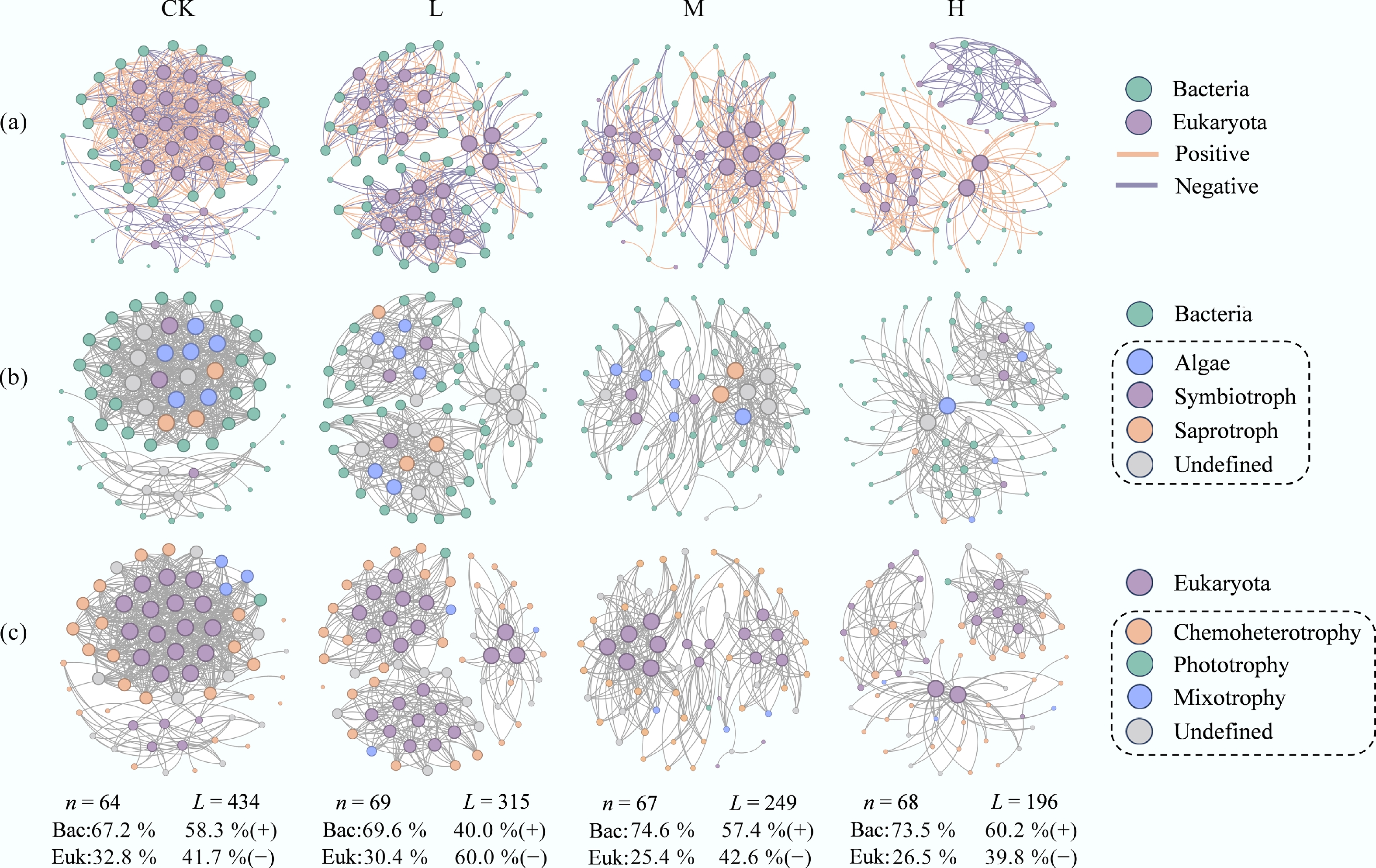 DNA fragments from the microbial communities were subjected to paired-end sequencing on the Illumina platform. The Good's coverage index for all samples exceeded 99.5%, indicating high sequencing coverage and reliability. QIIME2 (2019.4) was used for annotation, analysis, clustering, and taxonomic classification of species at consistent sequencing depths. Relative abundance and diversity indices were calculated using the Greengenes database for bacteria and a customized database for eukaryota. Fungal trophic modes and bacterial ecological functions were annotated using the FUNGuild and FAPROTAX databases, respectively. Metabolic pathways of bacterial and eukaryotic communities were predicted using PICRUSt2 (Phylogenetic Investigation of Communities by Reconstruction of Unobserved States).