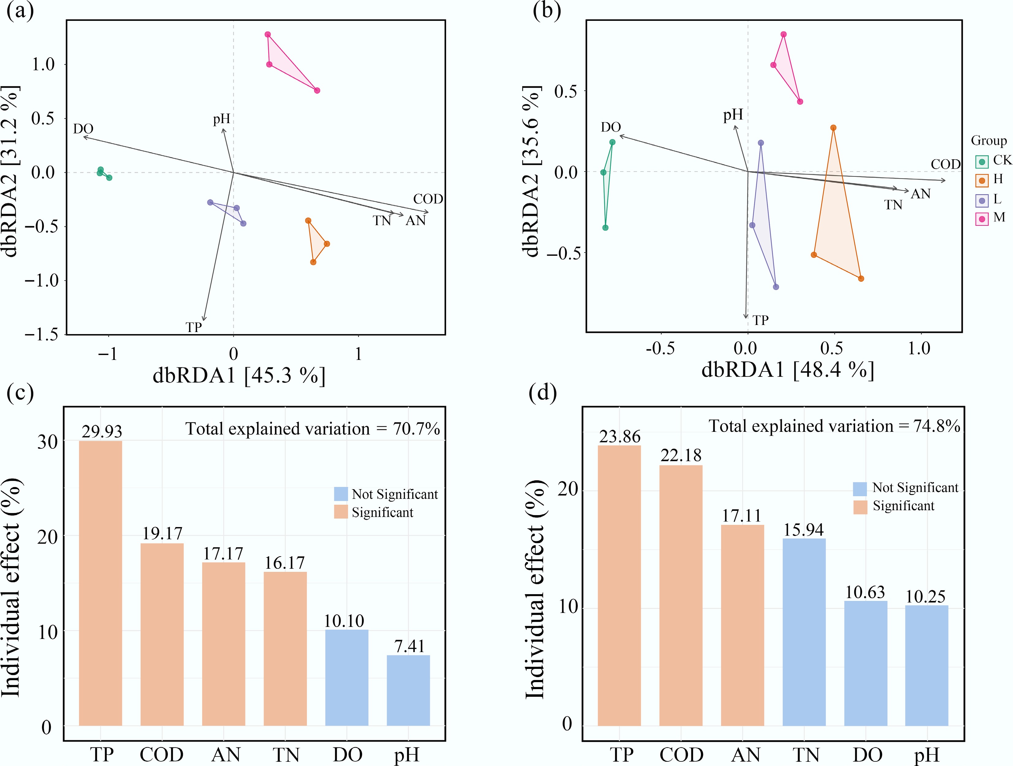 Water nutrient levels are the primary environmental drivers of periphyton community composition. Distance-based redundancy analysis (dbRDA) of (a) bacterial, and (b) eukaryotic communities. The individual impact of each environmental factors on (c) bacteria, and (d) eukaryota is calculated based on the 'rdacca.hp' package.