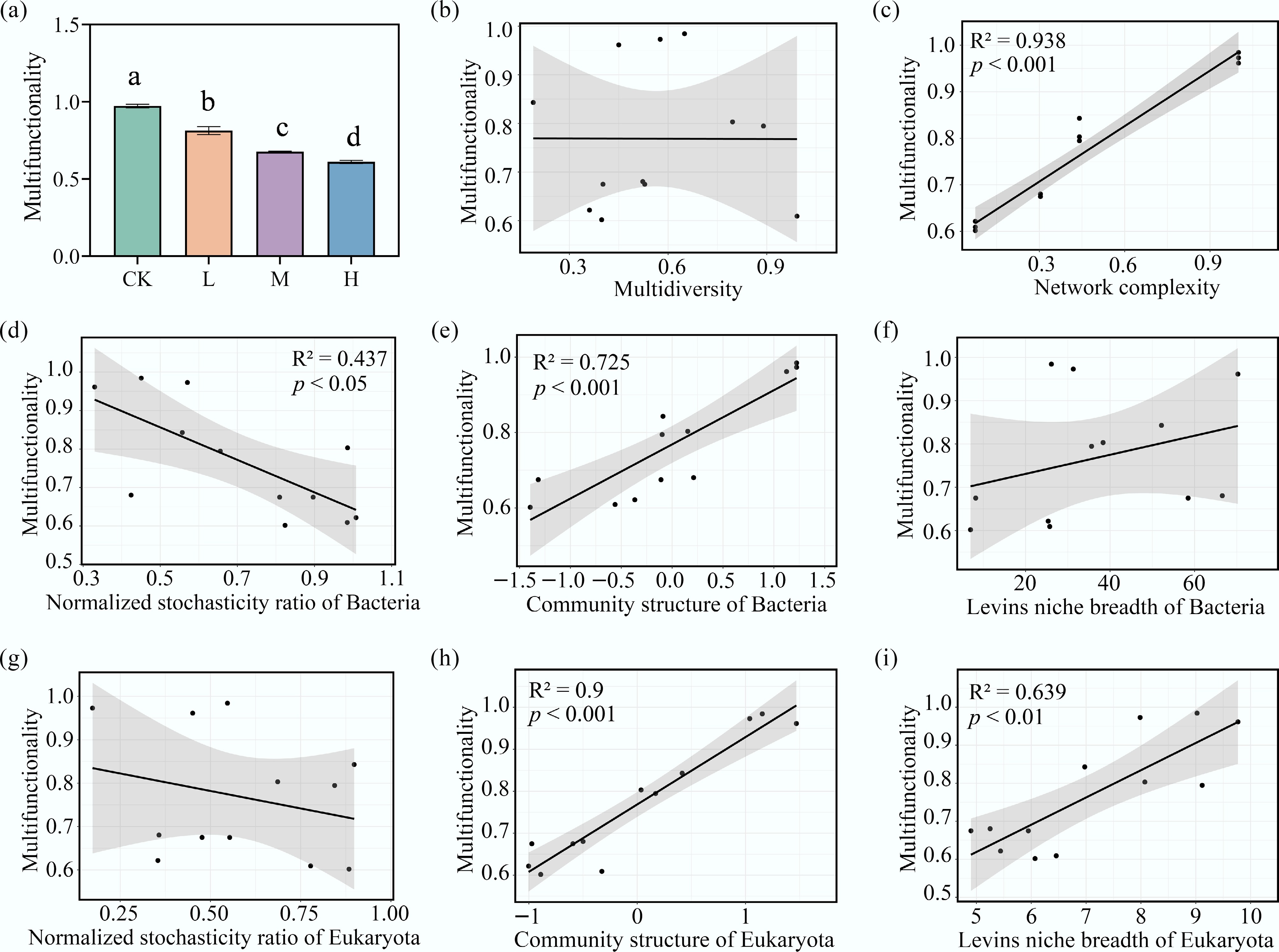 Key microbial properties driving the decline of ecosystem multifunctionality under HAP stress. (a) The ecosystem multifunctionality (MF) index across treatments. Linear relationships between MF and the (b) multidiversity, (c) the network complexity, the normalized stochasticity ratio (NST) of (d) bacteria, and (g) eukaryota, the community structure (PCoA axis1) of (e) bacteria, and (h) eukaryota, and the Levins' niche breadth of (f) bacteria, and (i) eukaryota.