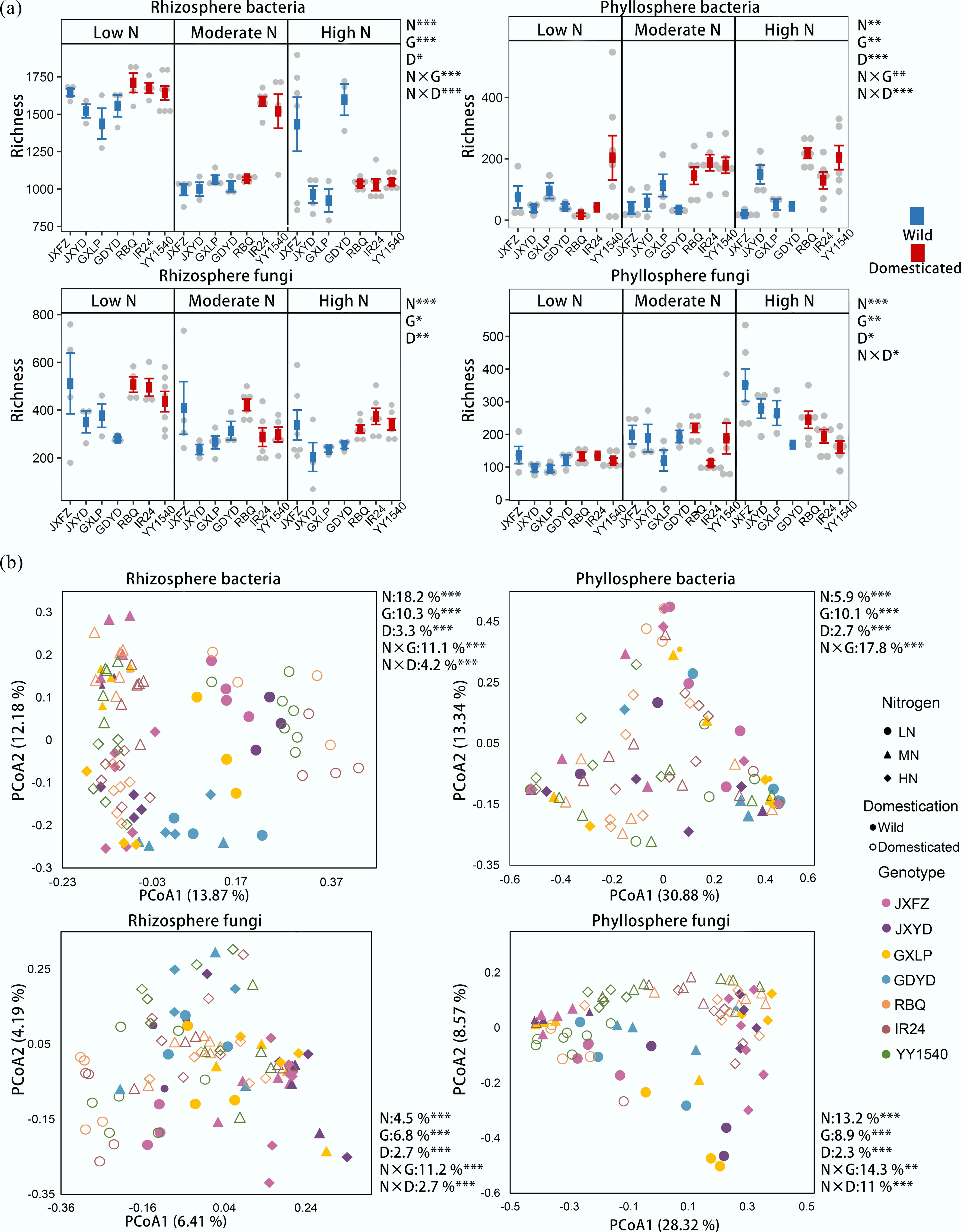 Comparison of microbial communities in the rhizosphere and phyllosphere of different rice genotypes under three nitrogen fertilizer application levels. (a) Bacterial and fungal community richness. Data are presented as mean ± standard deviation (SD). (b) Principal coordinate analysis (PCoA) of bacterial and fungal community composition based on Bray-Curtis distances. The PERMANOVA results reveal the relative contributions of nitrogen addition (N), the identity of rice genotypes (G), and domestication status (D), as well as their interactions to bacterial and fungal richness and community composition. Significance levels of 0.05, 0.01, and 0.001 are represented by *, **, and ***, respectively.
