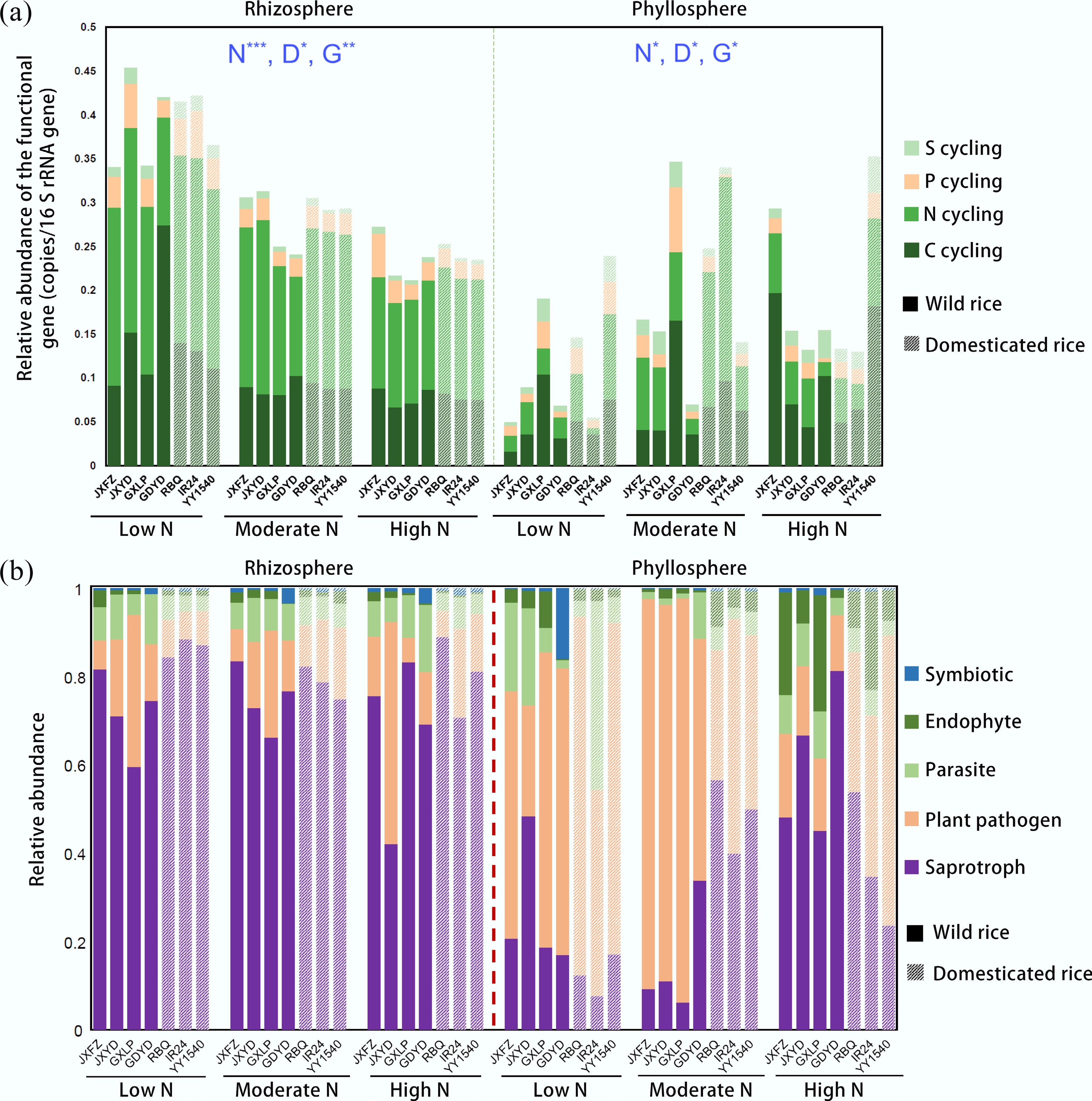 Shifts in functional genes and fungal traits in the rhizosphere and phyllosphere of different rice genotypes under three nitrogen fertilizer application levels. (a) Relative abundance of functional genes. (b) Relative abundance of fungal traits among the total identified traits. PERMANOVA analysis reveals significant differences in functional genes between nitrogen addition (N), the identity of rice genotypes (G), and domestication status (D); Significance levels are represented as follows: * p < 0.05; ** p < 0.01; and *** p < 0.001.