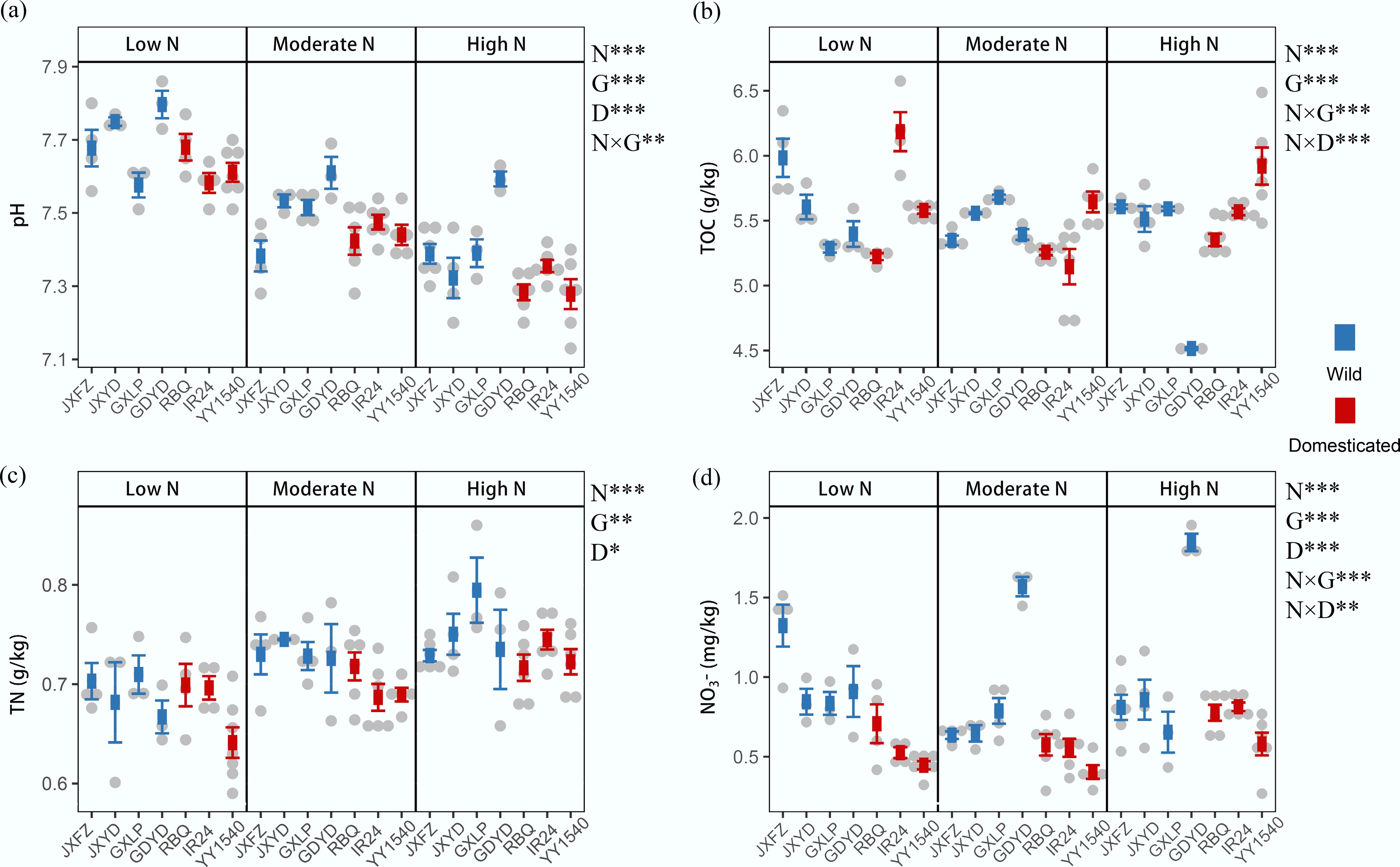 Effects of nitrogen addition (N), domestication status (D), and identity of rice genotypes (G) on rhizosphere soil properties. (a) Soil pH. (b) Total organic carbon (TOC). (c) Total nitrogen (TN). (d) Nitrate nitrogen (NO3–-N). The data are presented as mean ± SD. PERMANOVA results indicate significant differences between treatment groups; * p < 0.05; ** p < 0.01; and *** p < 0.001.