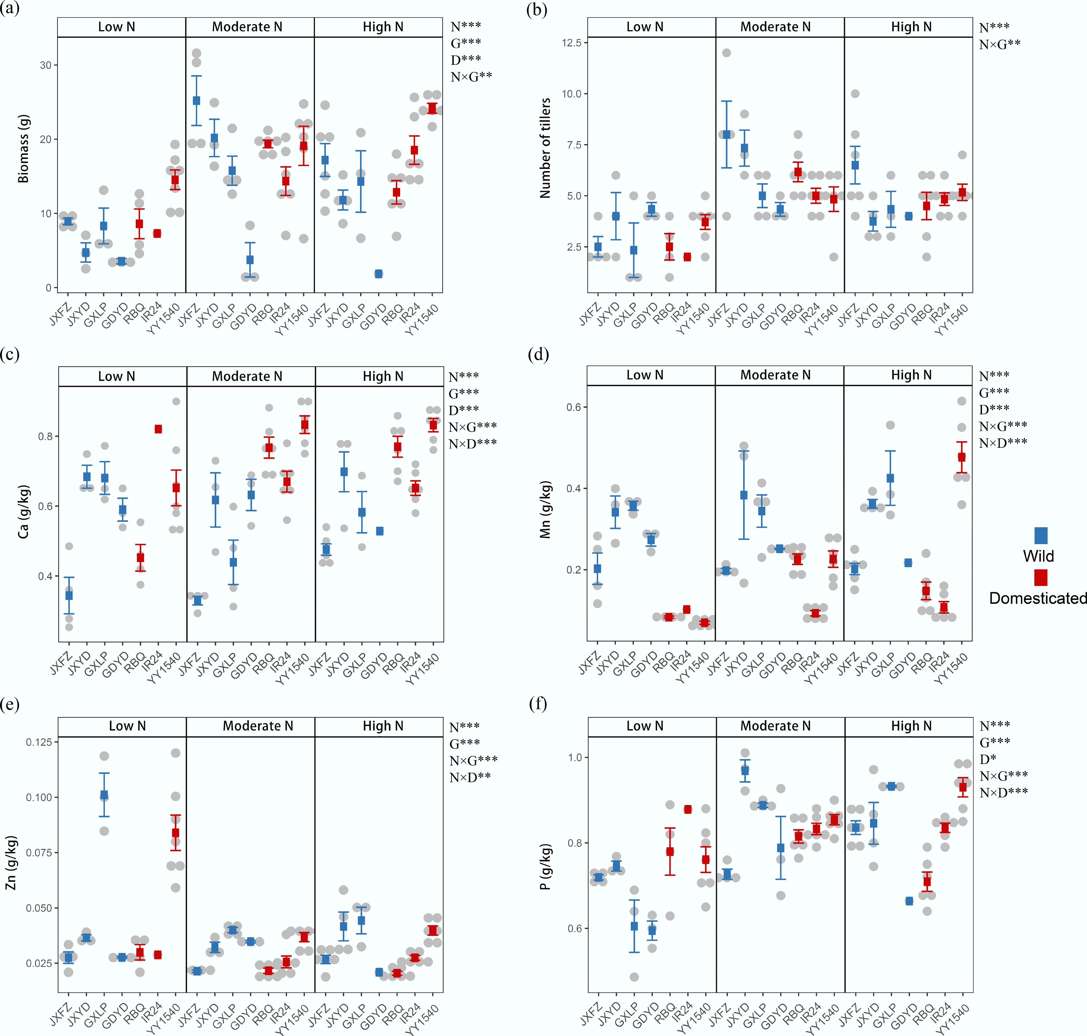 Effects of nitrogen addition (N), domestication status (D), and identity of rice genotypes (G) on rice functional traits. (a) Aboveground biomass. (b) Tiller number. Leaf concentrations of mineral elements: (c) calcium (Ca), (d) manganese (Mn), (e) zinc (Zn), and (f) phosphorus (P). Data are presented as mean ± SD. PERMANOVA results reveal significant differences between treatment groups; * p < 0.05; ** p < 0.01; and *** p < 0.001.
