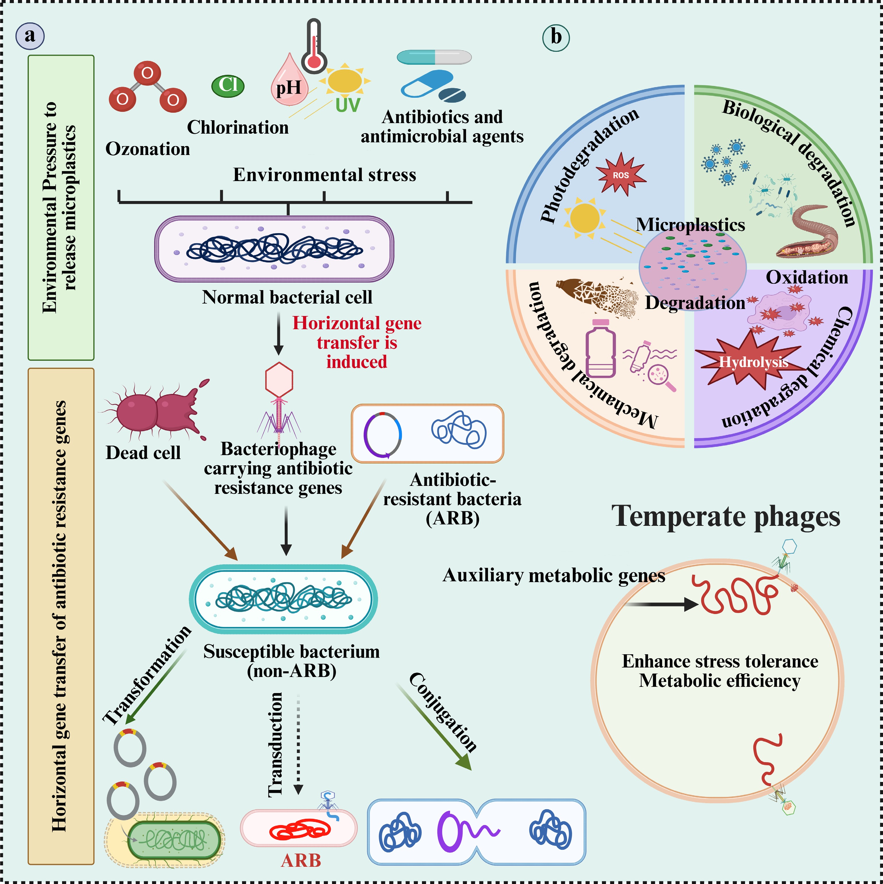 Schematic representation of the proposed role of microplastics (MPs) in microbial adaptation under environmental stress. (a) Environmental stressors, such as ozonation, chlorination, UV radiation, pH changes, and antibiotics which accelerate the oxidation, hydrolysis, and ionization of MPs. These processes promote the degradation of MPs and the generation of reactive oxygen species (ROS). (b) The same stressors also induce horizontal gene transfer (HGT), particularly transduction, wherein bacteriophages carrying antibiotic resistance genes (ARGs) transfer these genes to susceptible bacteria, converting them into antibiotic-resistant bacteria (ARB). Additionally, dead cells may release ARGs that are acquired via transformation. MP degradation enhances microbial stress tolerance and metabolic efficiency, creating a feedback loop that supports the survival and proliferation of ARB under persistent environmental stress. ARB: antibiotic-resistant bacteria; ARGs: antibiotic resistance genes.
