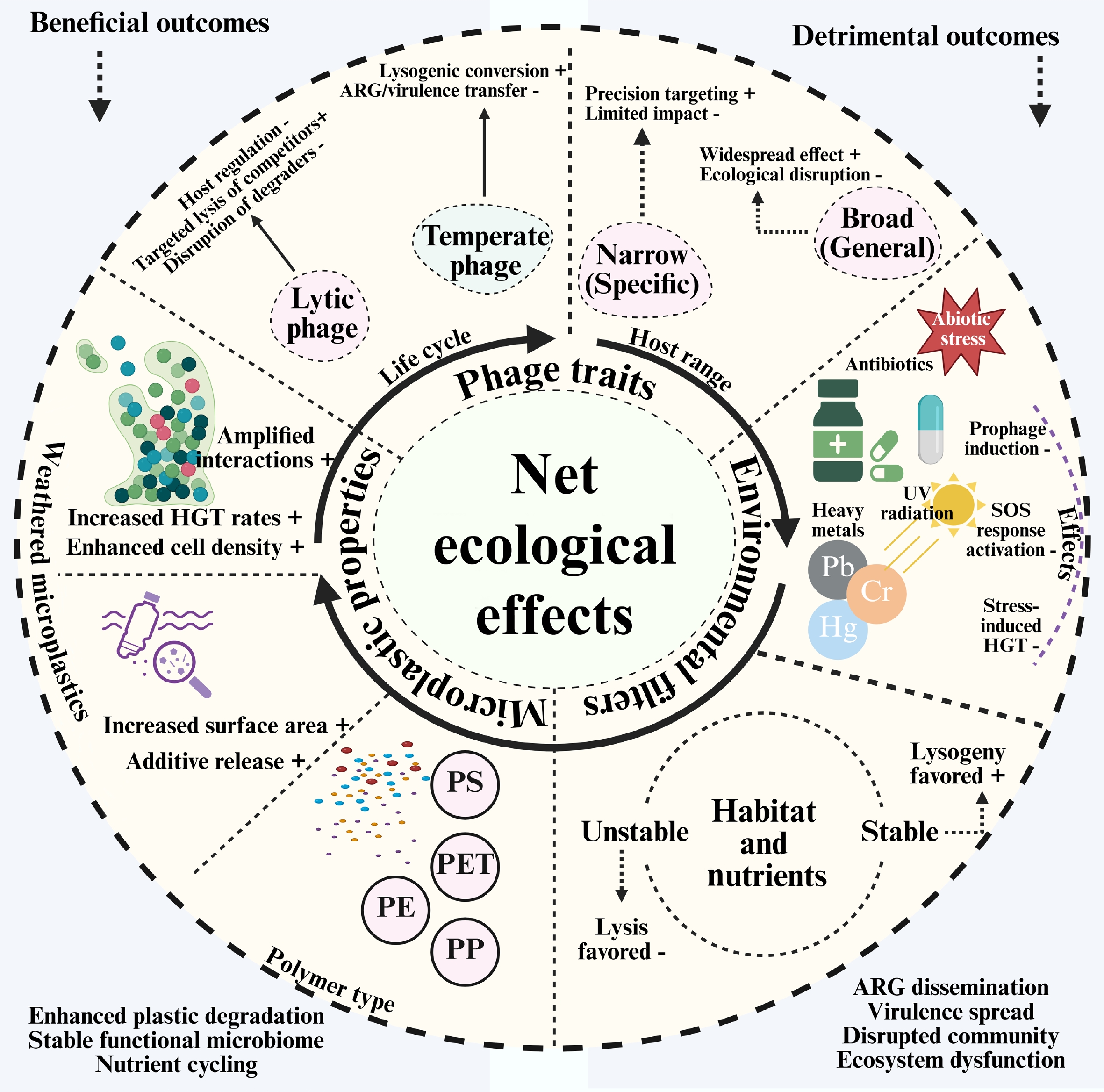 The primary function of lytic phages is top-down regulation. Host specificity has a significant influence on their overall impact. Selective lysis can, in some cases, shift community composition by suppressing particular host populations; however, phages do not 'target' organisms based on ecological function, and whether lysis favors degraders or non-degraders is context dependent. Furthermore, regardless of their significance, non-specific or broad-host-range lytic activity can kill crucial degraders, such as Bacillus or Pseudomonas, halting biodegradation, and destroying the functional community[50]. Through lysogeny, temperate phages act as genetic modulators. By altering the host bacterium's DNA to confer beneficial characteristics, such as enzymes that degrade plastic (like PETase), genes that enhance its stress tolerance, or elements that facilitate biofilm formation, integrating a prophage can be beneficial[51]. The primary risk occurs when the prophage is activated. In addition to killing the host, environmental stressors can trigger a synchronized lytic cycle that disperses any encoded genes, such as virulence factors or ARGs, across the biofilm[52]. For focused actions that don't significantly alter the environment, a host range that incorporates a phage with a limited host range is also beneficial. Conversely, a phage with a broad host range is more likely to have both beneficial and detrimental effects. For instance, it might widely enhance a catabolic function or disperse ARGs, which would make its ecological effects less predictable and perhaps more extensive[53].