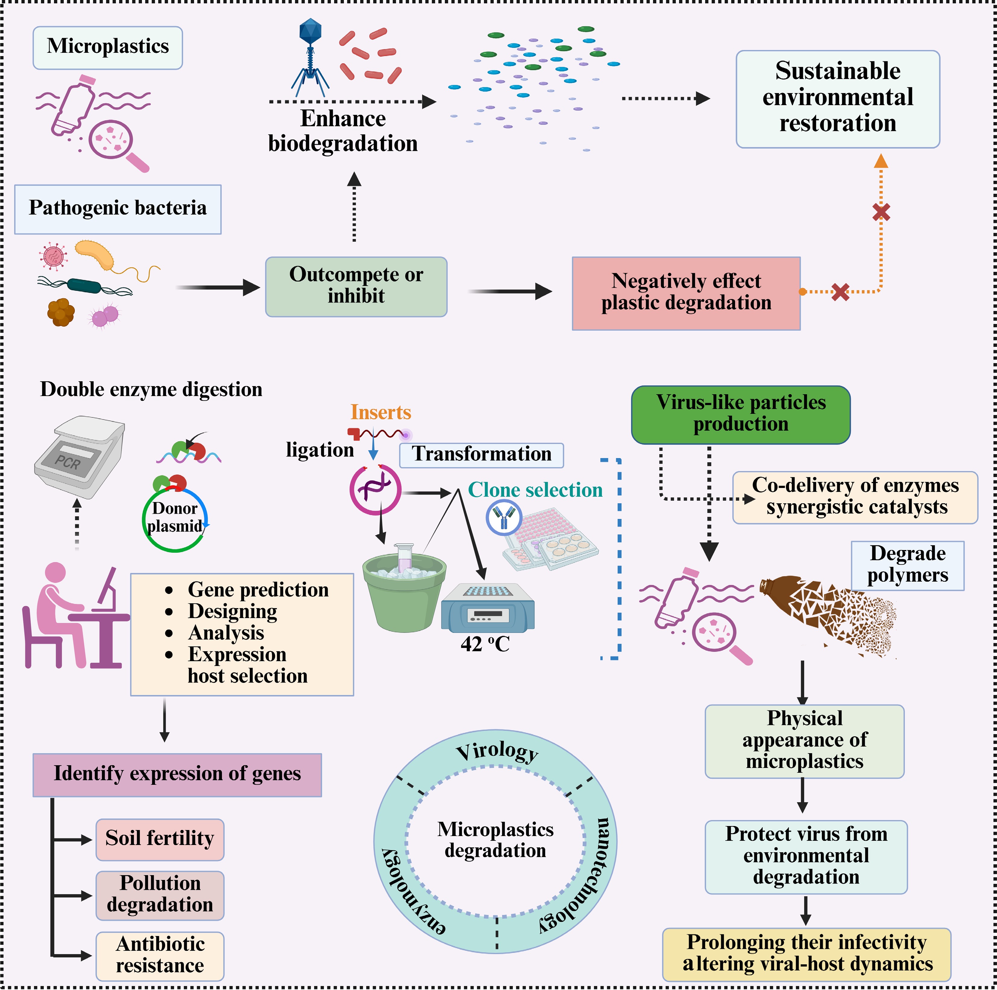 A multi-step approach combining genetic engineering and viral-like particles to improve microplastic degradation and soil bioremediation. It includes: (1) double enzyme digestion for plasmid preparation, gene prediction, and expression host selection; (2) ligation and transformation for clone selection (42 °C); and (3) virus-like particle production to co-deliver synergistic enzymes while protecting viral infectivity. It also highlights the challenges posed by pathogenic bacteria that may inhibit plastic degradation, as well as strategies to monitor the impacts of gene expression on soil fertility, pollution degradation, and antibiotic resistance.