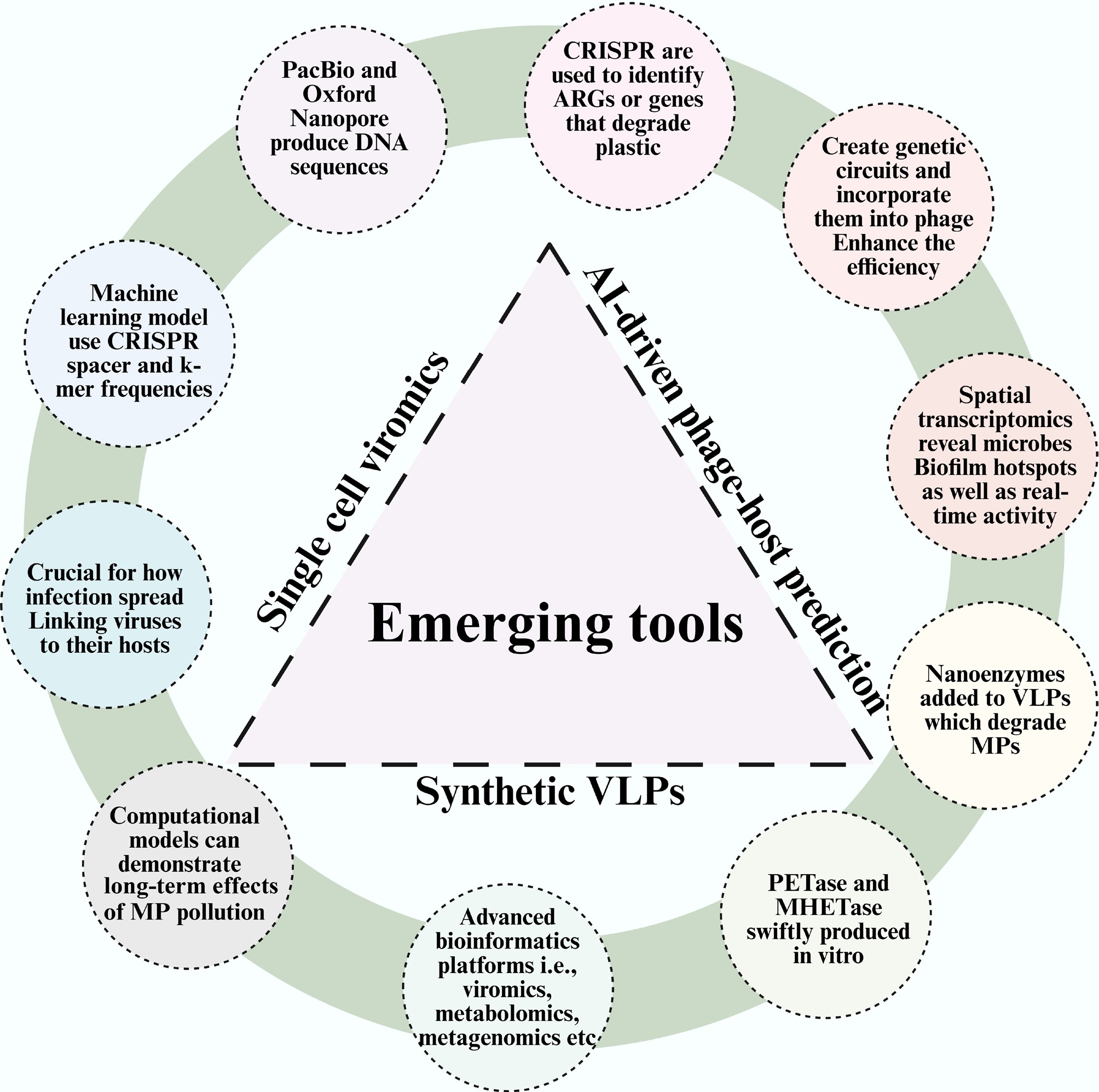 The way we study and address the connections between viruses, microbes, and MPs is set to alter due to new techniques. We can now analyze these complex systems and develop targeted bioremediation strategies with an unprecedented degree of detail thanks to new technologies like single-cell viromics, AI-driven phage-host prediction, and synthetic virus-like particles (Fig. 4). These cutting-edge technologies must be integrated in order to transform fundamental ecological information into solutions that can be used widely. A few of them are discussed below: