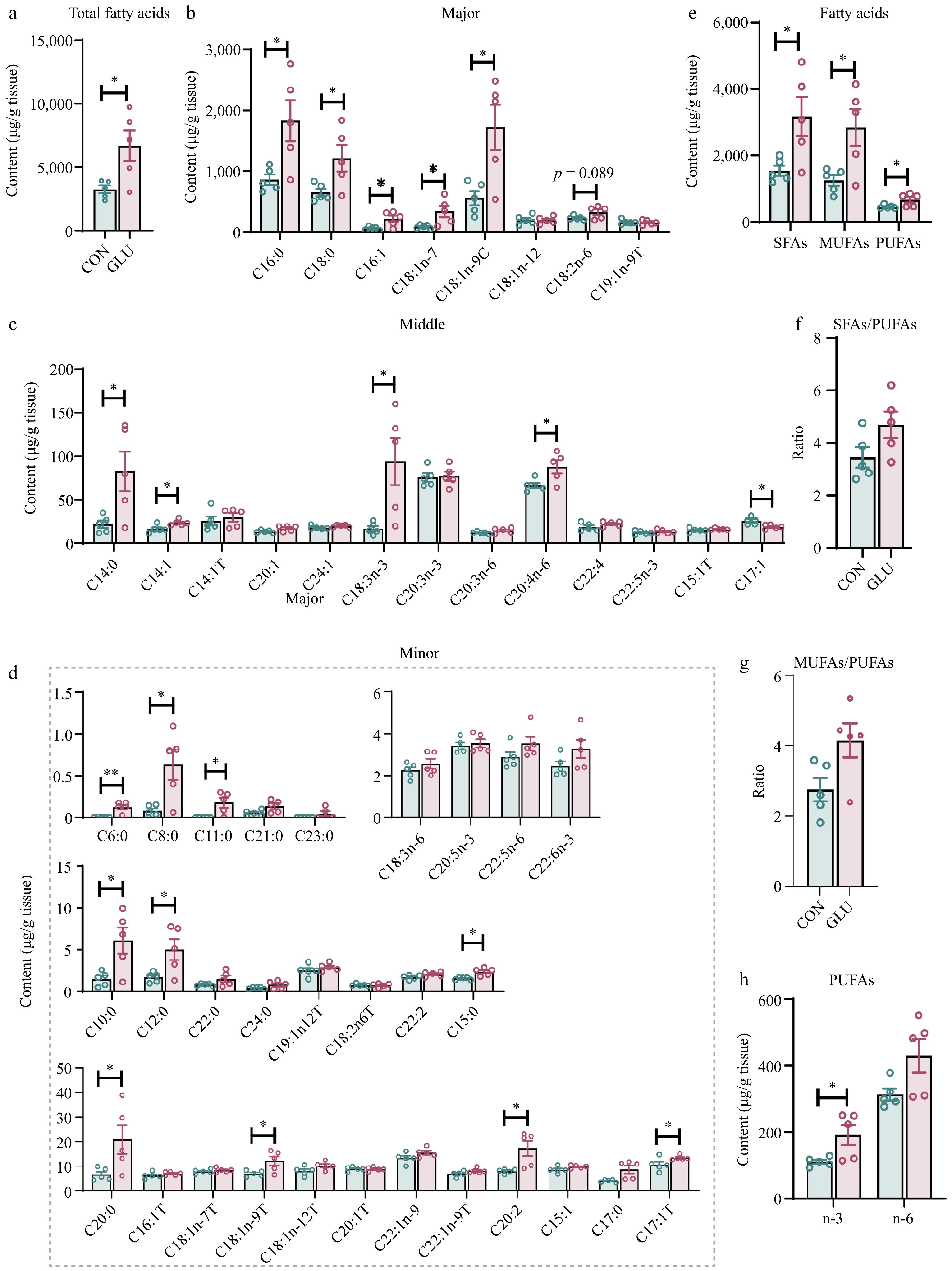 Glu optimized the fatty acid profile in LD muscle of Shaziling pigs. (a) The total fatty acid content. The concentration of individual fatty acids in the LD muscle. Fatty acids are categorized into (b) major, (c) middle, and (d) minor classes based on their relative abundance, and classified by the degree of saturation. (e) Total SFAs, MUFAs, and PUFAs in muscle from Glu and Con pigs. SFAs, saturated fatty acids; MUFAs, monounsaturated fatty acids; PUFAs, polyunsaturated fatty acids containing two or three to six double bonds. (f) The ratio of SFA to PUFA. (g) The ratio of MUFA to PUFA. (h) The content of n-3 PUFA and n-6 PUFA. n = 5. The error bars represent the SEM. * p < 0.05, ** p < 0.01, two-tailed Student's t-test.