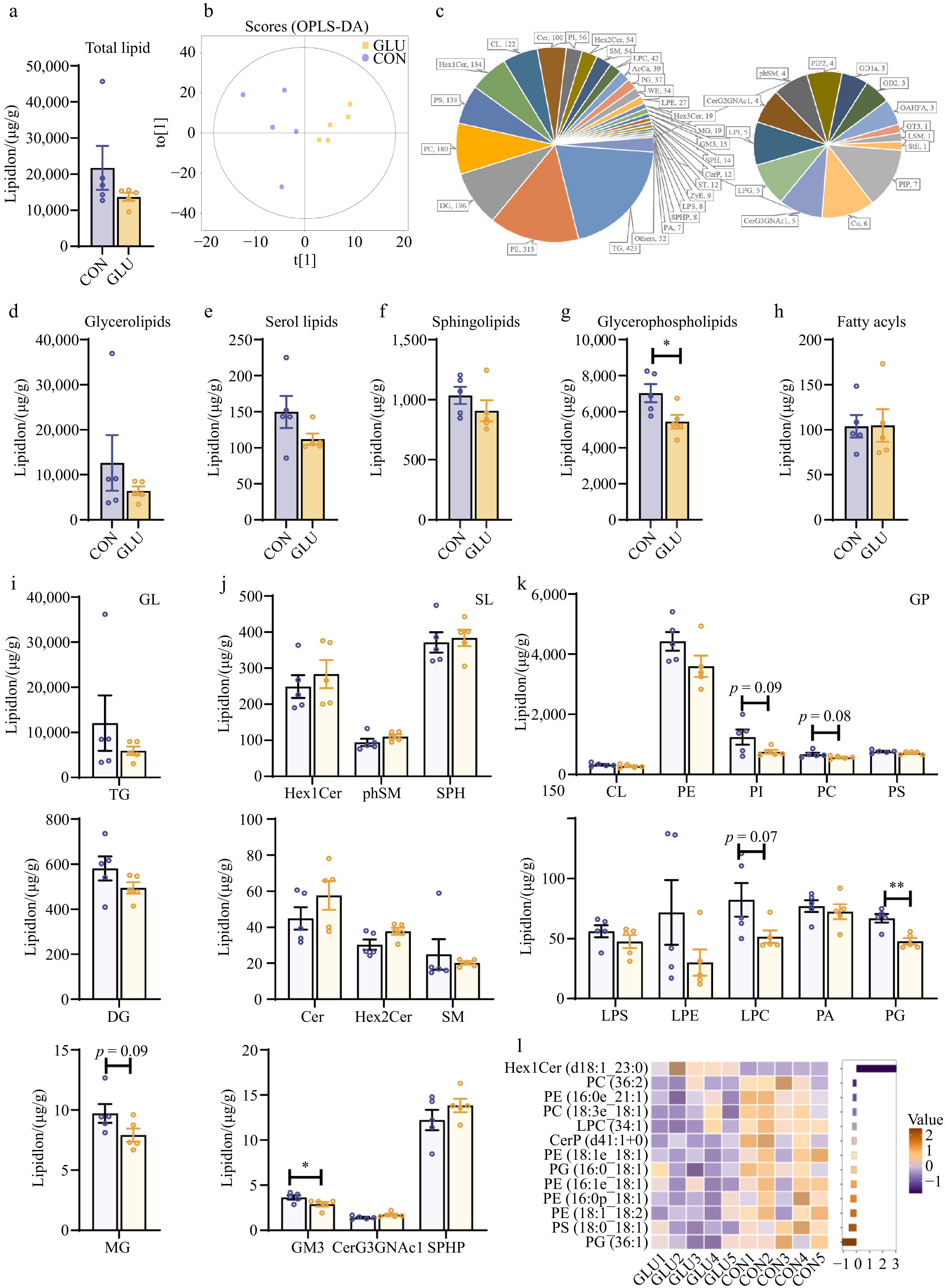 Effects of Glu on the lipid composition of LD muscle of Shaziling pigs. (a) The content of total lipids. (b) The orthogonal projections to latent structures discriminant analysis (OPLS-DA) plot. (c) The types and amounts of lipids in LD muscle of Shaziling pigs. (d)−(h) Content of different lipid classes in LD muscle of Shaziling pigs. (i) The content of glycerolipids subclasses. (j) The content of sphingolipid subclasses. (k) The content of glycerophospholipids subclasses. (l) Heat map of differential lipid species in LD muscle of Shaziling pigs. n = 5. Error bars represent SEM. * p < 0.05, two-tailed Student's t-test.