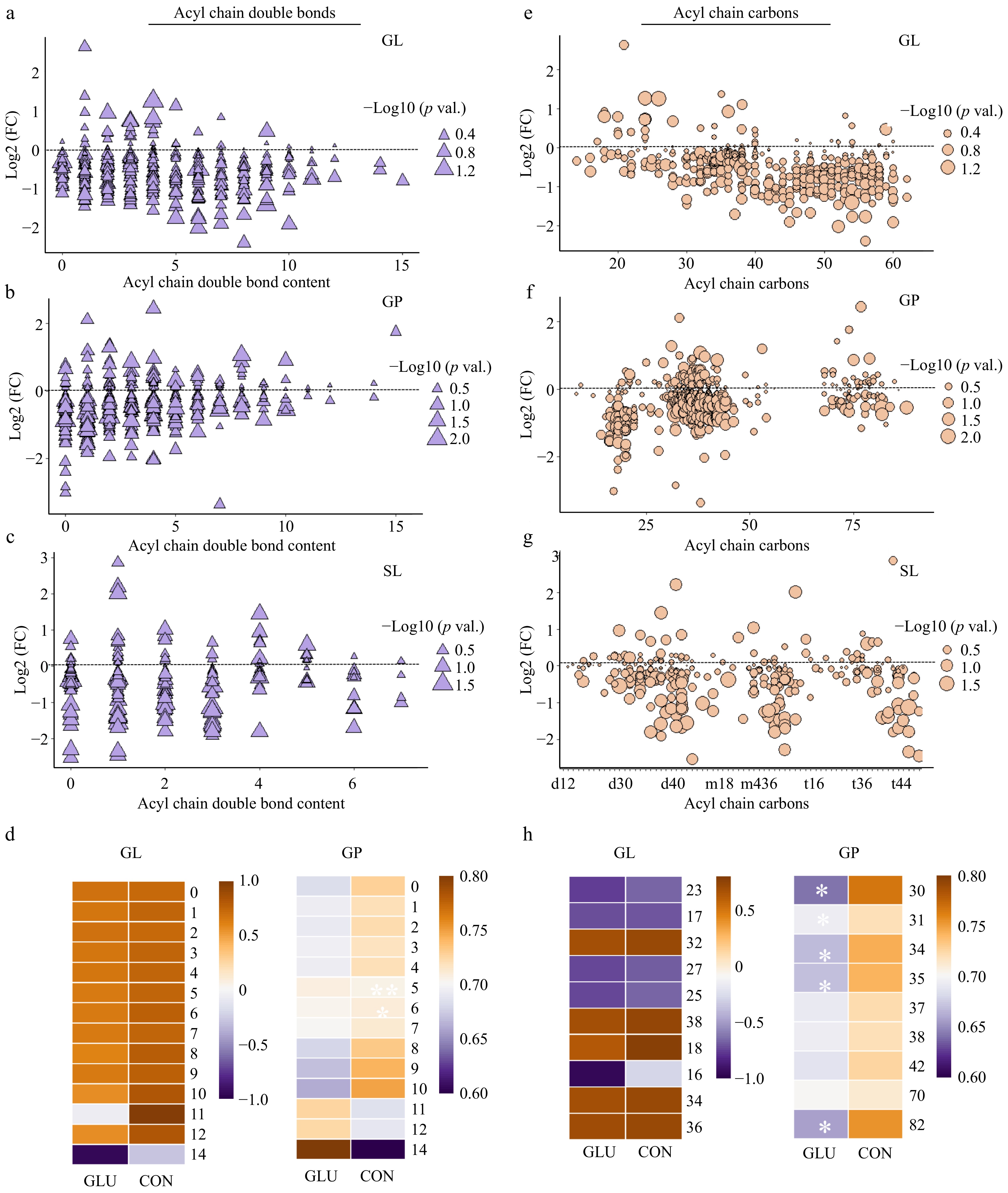 Glu affected the lipid acyl chain compositions in the LD muscle of Shaziling pigs. (a) GLs with different double bond contents. (b) GPs with double bond contents. (c) SLs with different double bond contents. (d) Heatmap of acyl chain double bond contents in GL and GP pools from the control and Glu groups. (e) GLs with different numbers of carbon atoms. (f) GPs with different numbers of carbon atoms. (g) SLs with different numbers of carbon atoms. (h) Heatmap of acyl chain carbon atoms in GL and GP pools from the control and Glu groups. n = 5. Error bars represent SEM. * p < 0.05, two-tailed Student's t-test.
