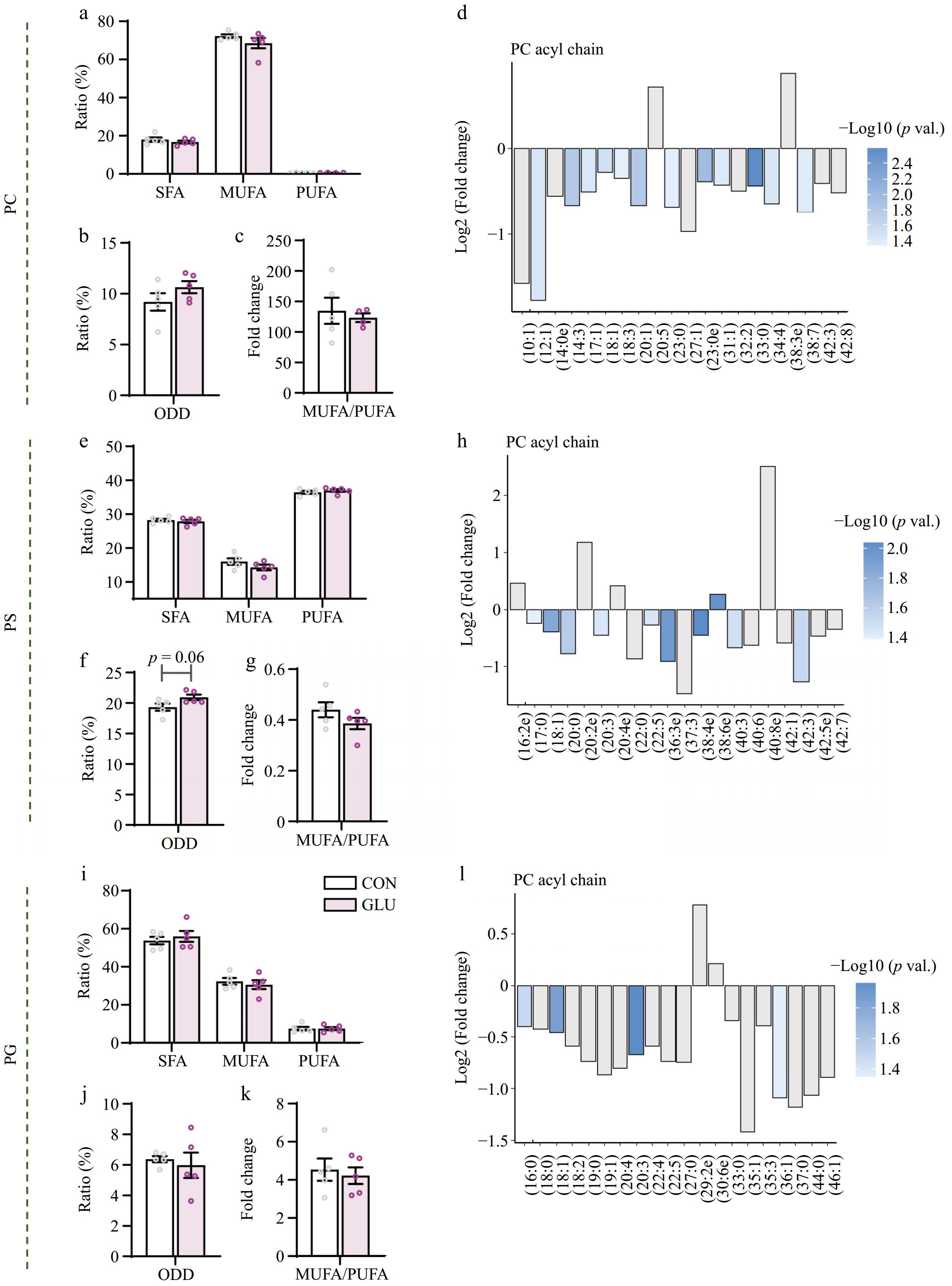 Glu impacted acyl chain saturation levels of glycerophospholipid in LD muscle. (a) PC acyl chain contents at different saturation levels. (b) The content of fatty acyl chains with odd-numbered carbons in the PC pool. (c) The ratio of MUFA to PUFA in the PC pool. (d) Fold changes in the intensity of individual fatty acyl chains associated with PCs and sorted by saturation. (e) PS acyl chain contents at different saturation levels. (f) The content of fatty acyl chains with odd-numbered carbons in the PS pool. (g) The ratio of MUFA to PUFA in the PS pool. (h) Fold changes in the intensity of individual fatty acyl chains associated with PSs and sorted by saturation. (i) PG acyl chain contents at different saturation levels. (j) The content of fatty acyl chains with odd-numbered carbons in the PG pool. (k) The ratio of MUFA to PUFA in the PG pool. (l) Fold changes in the intensity of individual fatty acyl chains associated with PGs and sorted by saturation. n = 5. Error bars represent SEM. * p < 0.05, two-tailed Student's t-test.