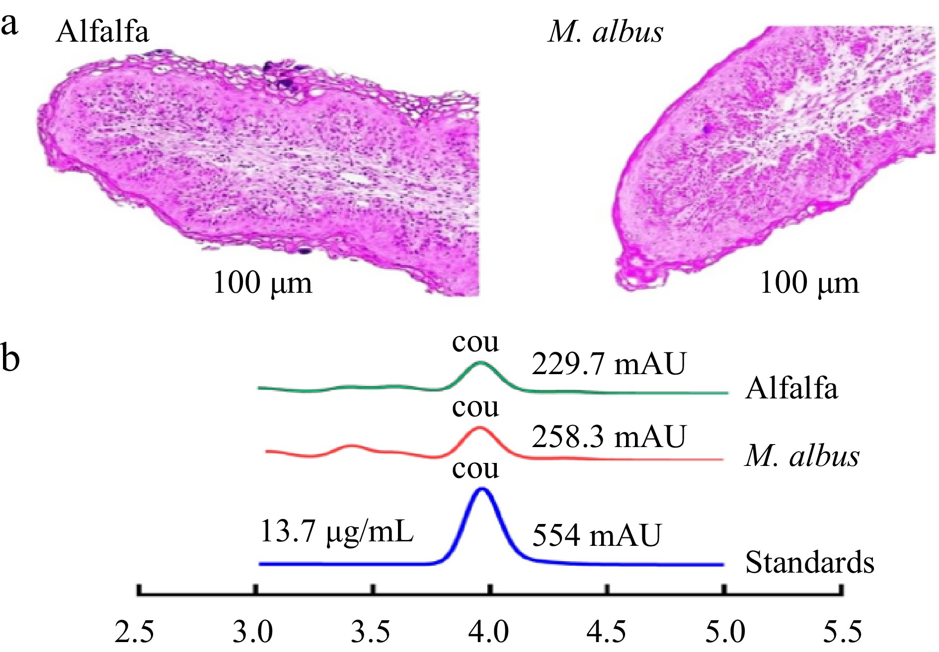 • Figure 1b demonstrates the effect of M. albus on the content of coumarin in rumen fluid. The content of coumarin in rumen fluid was measured. The peak area of the alfalfa hay and M. albus groups was the same, and the results showed that coumarin in rumen fluid was degraded.