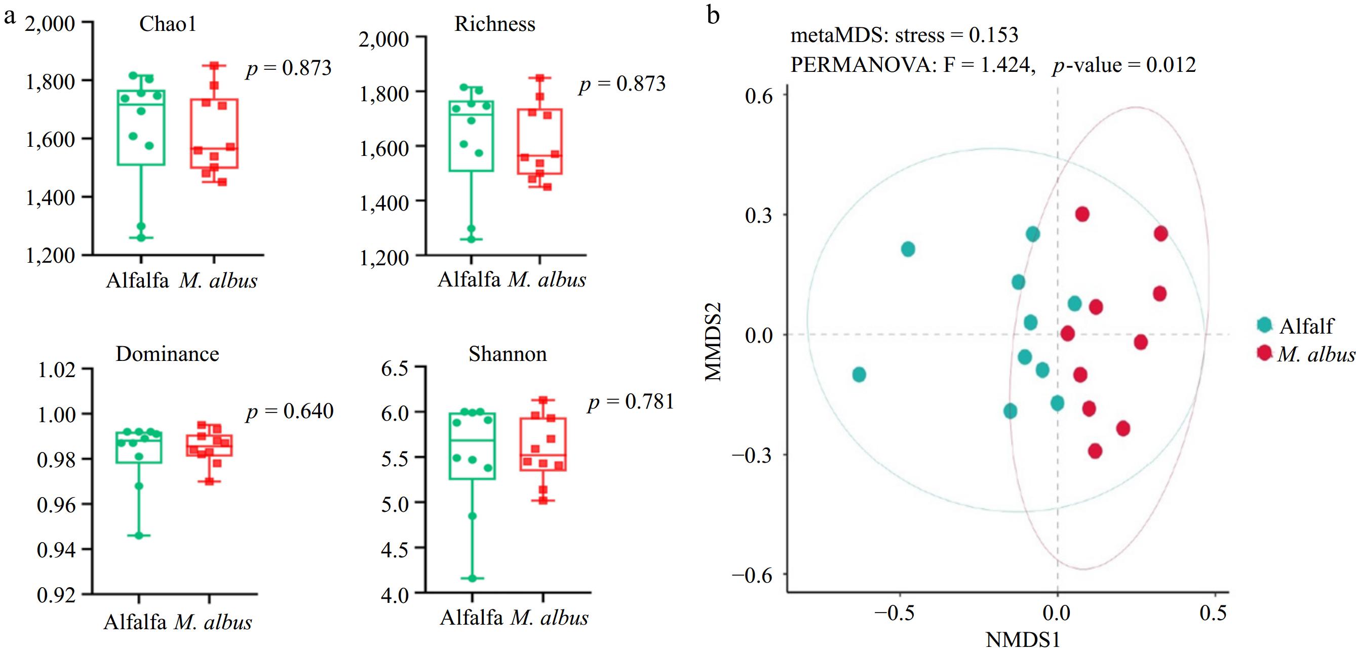 • The impacts of feeding M. albus on the α diversity index of the rumen microbial communities of lake sheep are displayed in Fig. 2a. As the image illustrates, feeding M. albus did not significantly affect the alpha diversity index of rumen microbial communities (Chao1, richness, dominance, Shannon, p > 0.05). The distances between sample points in the graph represent the disparities between individuals or groups. The degree of resemblance increases with the proximity of the samples on the graph. As depicted in Fig. 2b, Bray-Curtis NMDS analysis based on Bray-Curtis distance revealed significant structural separation of rumen bacterial communities at the phylum and genus levels (p < 0.05) regarding β diversity.