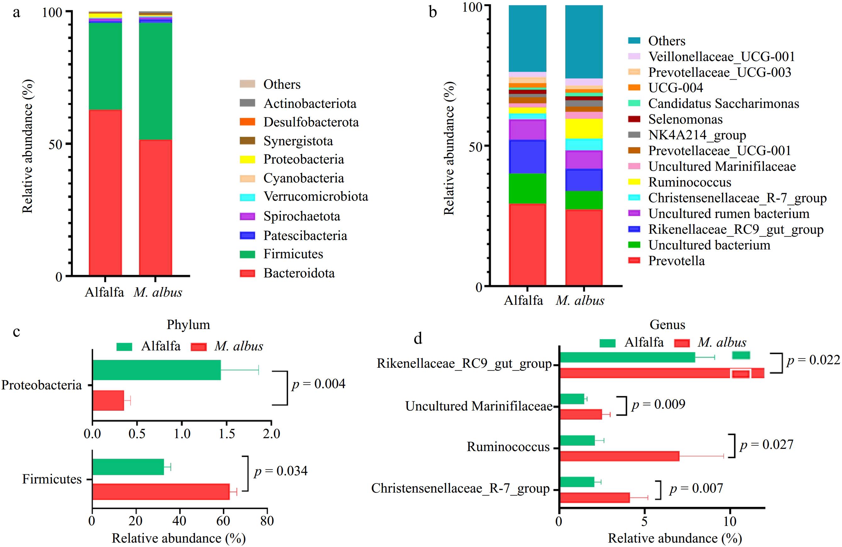 As shown in Fig. 3c, d, the LEfSe study of the rumen microbes of Hu sheep, ranging from the phylum level to the genus level. There were two distinct phyla and five distinct genera with LDA values larger than 3.5 compared to the alfalfa group. LEfSe analysis results showed that at the gate level, the relative abundance of Firmicutes in M. albus was significantly higher than that in alfalfa. In comparison, the relative abundance of Proteobacteria in group M. albus was significantly lower than that in alfalfa (p < 0.05). At the genus level, the relative abundance of Ruminococcus, Rikenellaceae_RC9_gut_group, Christensenellaceae_R-7_group, and uncultured Marinifilaceae in M. albus was significantly higher than alfalfa (p < 0.05).