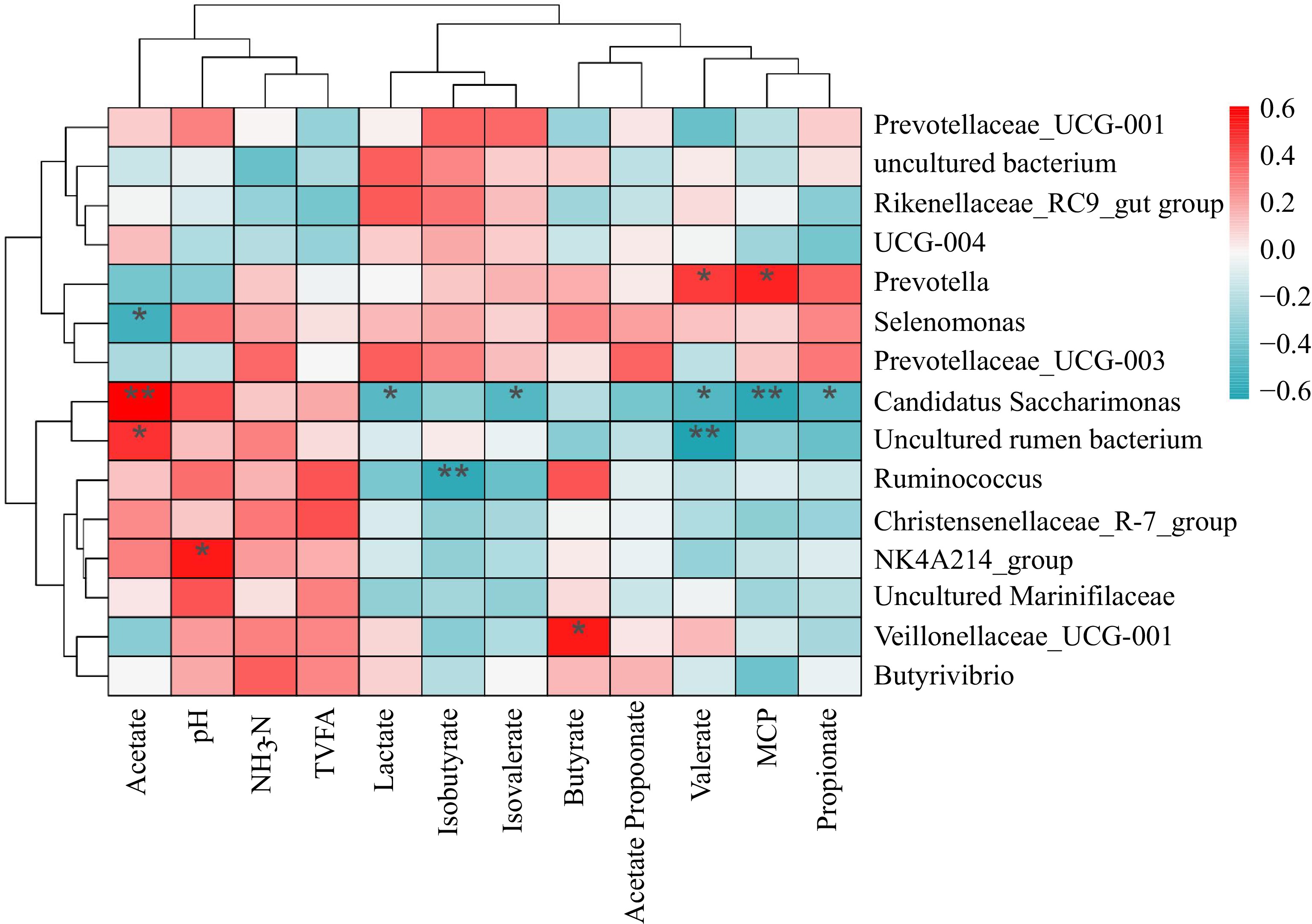 Heat maps were drawn based on the correlation between fermentation parameters and the relative abundance of the genus (> 1%) (Fig. 4). The results showed that Prevotella significantly correlates with microbial protein (MCP) and valerate. Candidatus Saccharimonas and uncultured rumen bacterium are significantly positively correlated with acetate. The NK4A214 group is significantly and positively correlated with pH.