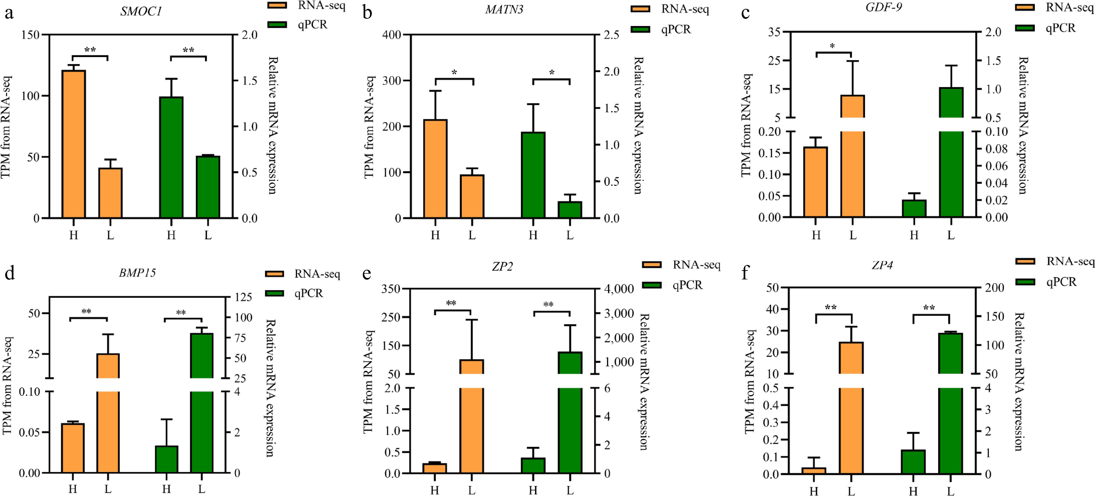 Comparison of the gene expression of RNA-seq with qPCR of 6 randomly selected genes. (a) SMOC1, (b) MATN3, (c) GDF-9, (d) BMP15, (e) ZP2, and (f) ZP4. Note: The left and right axes represent the gene expression using TPM units by RNA-seq and the expression levels verified by qPCR, respectively. The yellow column indicates TPM value; the green column indicates qPCR. All experiments are performed in triplicate, and the data are expressed as the mean ± SEM (* p < 0.05; ** p < 0.01).