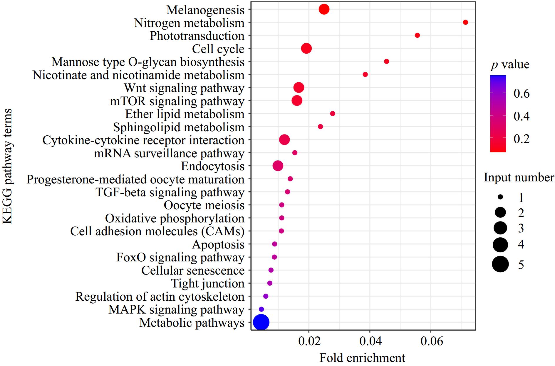 The KEGG pathway analysis revealed several enriched terms, including Wnt signaling pathway (gga04310), mTOR signaling pathway (gga04150), cell cycle (gga04110), TGF-beta signaling pathway (gga04350), oocyte meiosis (gga04114), FoxO signaling pathway (gga04068), cytokine-cytokine receptor interaction (gga04060), regulation of actin cytoskeleton (gga04810), and the calcium signaling pathway (gga04020) (Fig. 4, Supplementary Table S4).