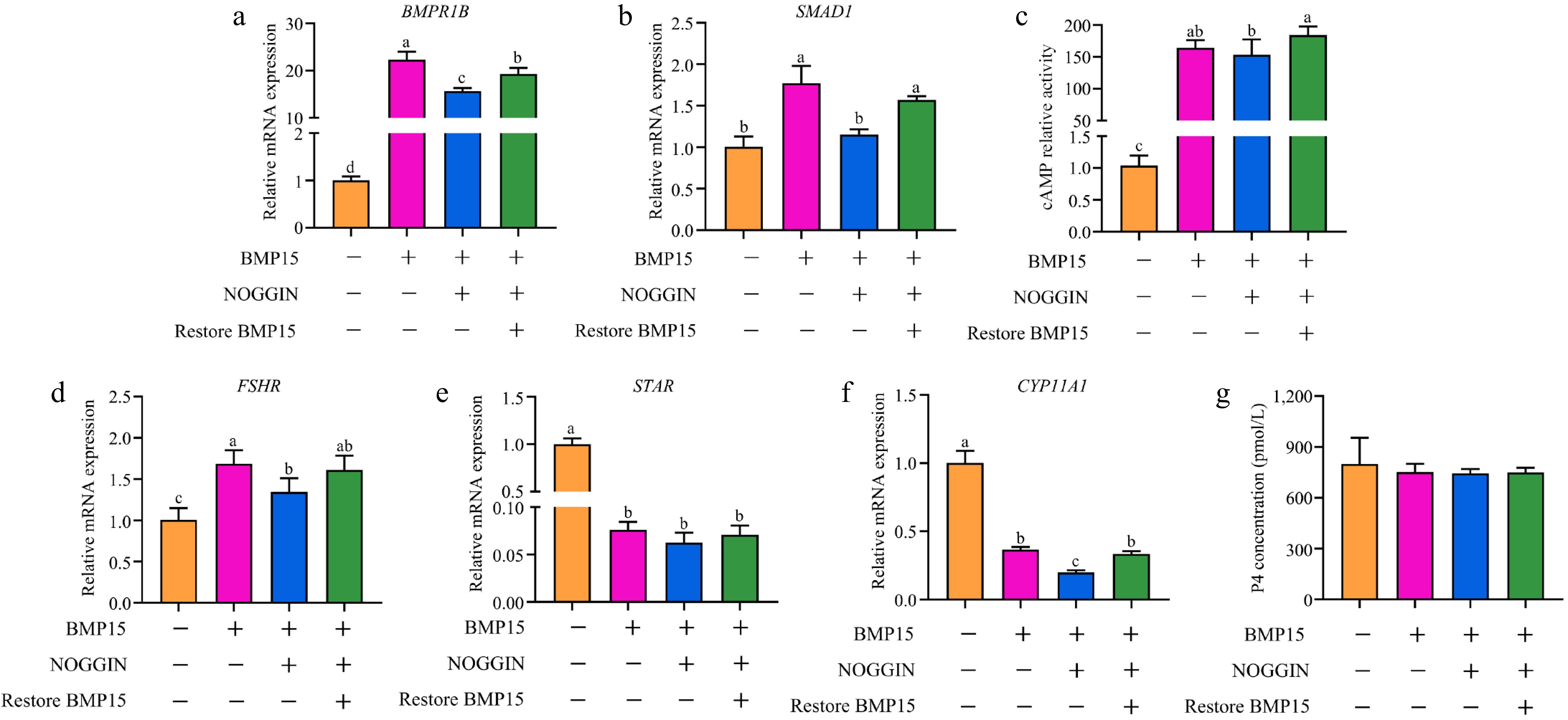 Subsequently, NOGGIN was added to the culture after 24 h of BMP15 treatment. The addition of NOGGIN resulted in a significant decrease in the expression of BMPR1B (Fig. 5a), indicating an effective disruption of the BMP15-BMPR1B binding. The expression of SMAD1 also decreased (Fig. 5b), suggesting that the SMAD1/5/8 signaling pathway was inhibited. Following NOGGIN addition, FSHR expression significantly decreased (Fig. 5d), and there was non-significant trend towards reduced cAMP activity and P4 concentration (Fig. 5c, g). The expression of STAR and CYP11A1 had a similar trend. These results showed that inhibiting BMP15 leads to a reduction in signaling pathway activity and key gene expression.