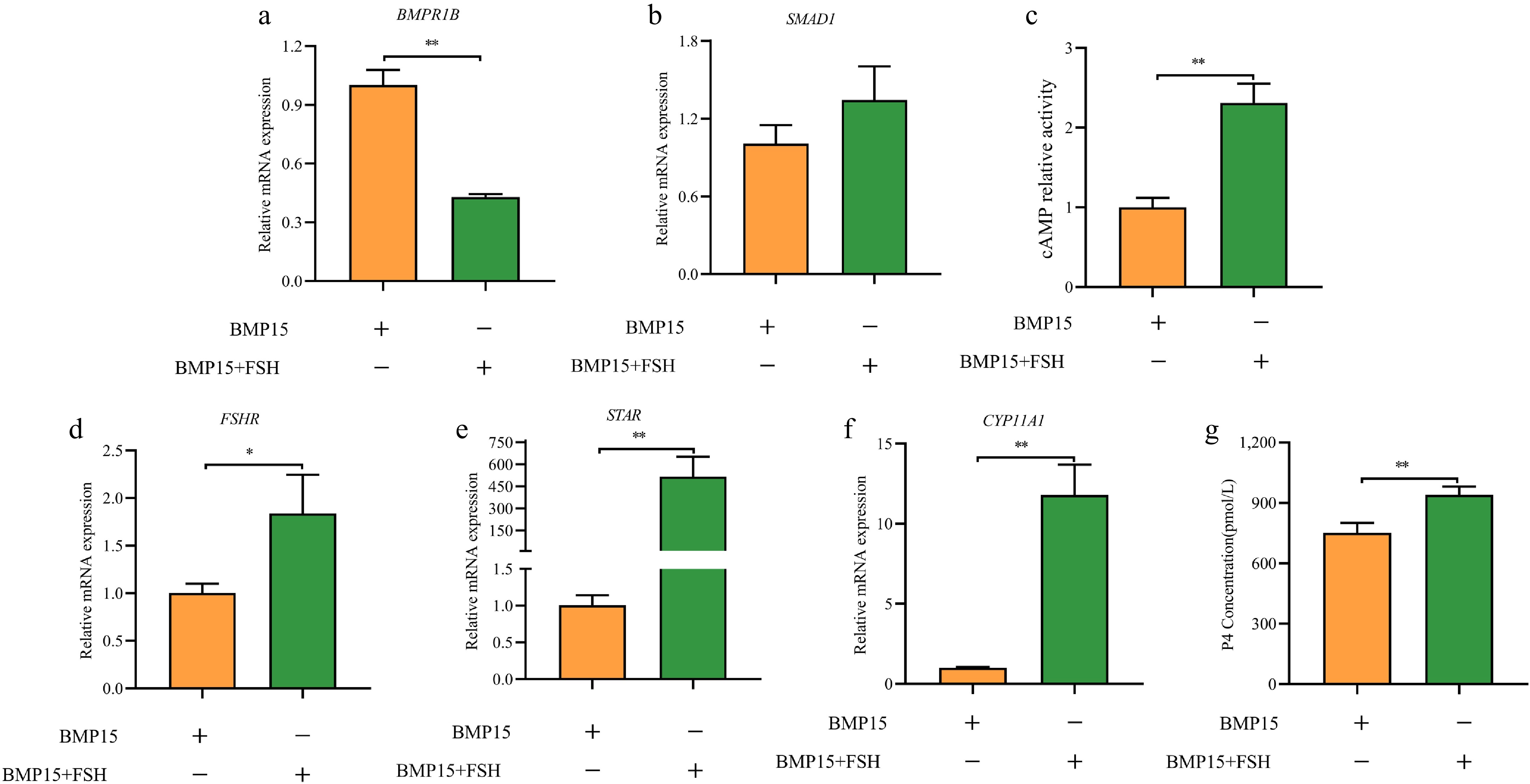 FSH and BMP15 affected the expression of related genes. (a) BMPR1B, (b) SMAD1, (d) FSHR, (e) STAR, and (f) CYP11A1. (c) cAMP relative activity, and (g) P4 concentration. Note: All experiments were performed in triplicate, and the data are expressed as the mean SEM (* p < 0.05; ** p < 0.01).