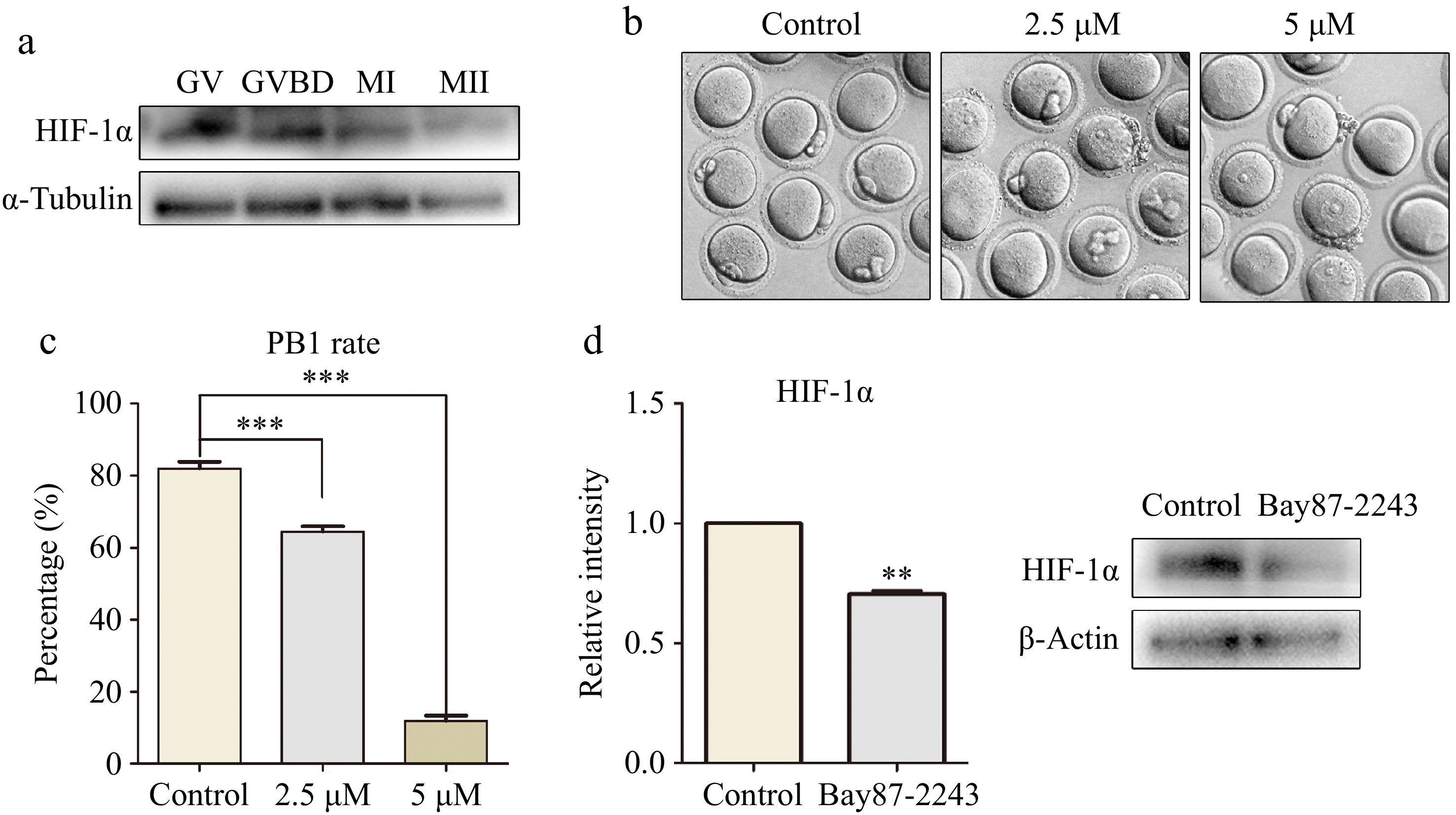 The inhibition of HIF-1α activity led to the failure of oocyte maturation. (a) Western blot results showed that mouse oocytes expressed HIF-1α at different maturation stages (GV, GVBD, MI, and MII). (b) Digital image correlation (DIC) images of control oocytes and Bay87-2243 treated oocytes after 14 h of culture. Bar = 80 μm. (c) The rate of polar body extrusion after 14 h of culture in the control group and Bay87-2243 treatment group. *** Significant difference (p < 0.001). (d) Western blot was used to analyze the inhibition efficiency of Bay87-2243 on HIF-1α protein expression. HIF-1α protein intensity analysis. ** Significant difference (p < 0.01).