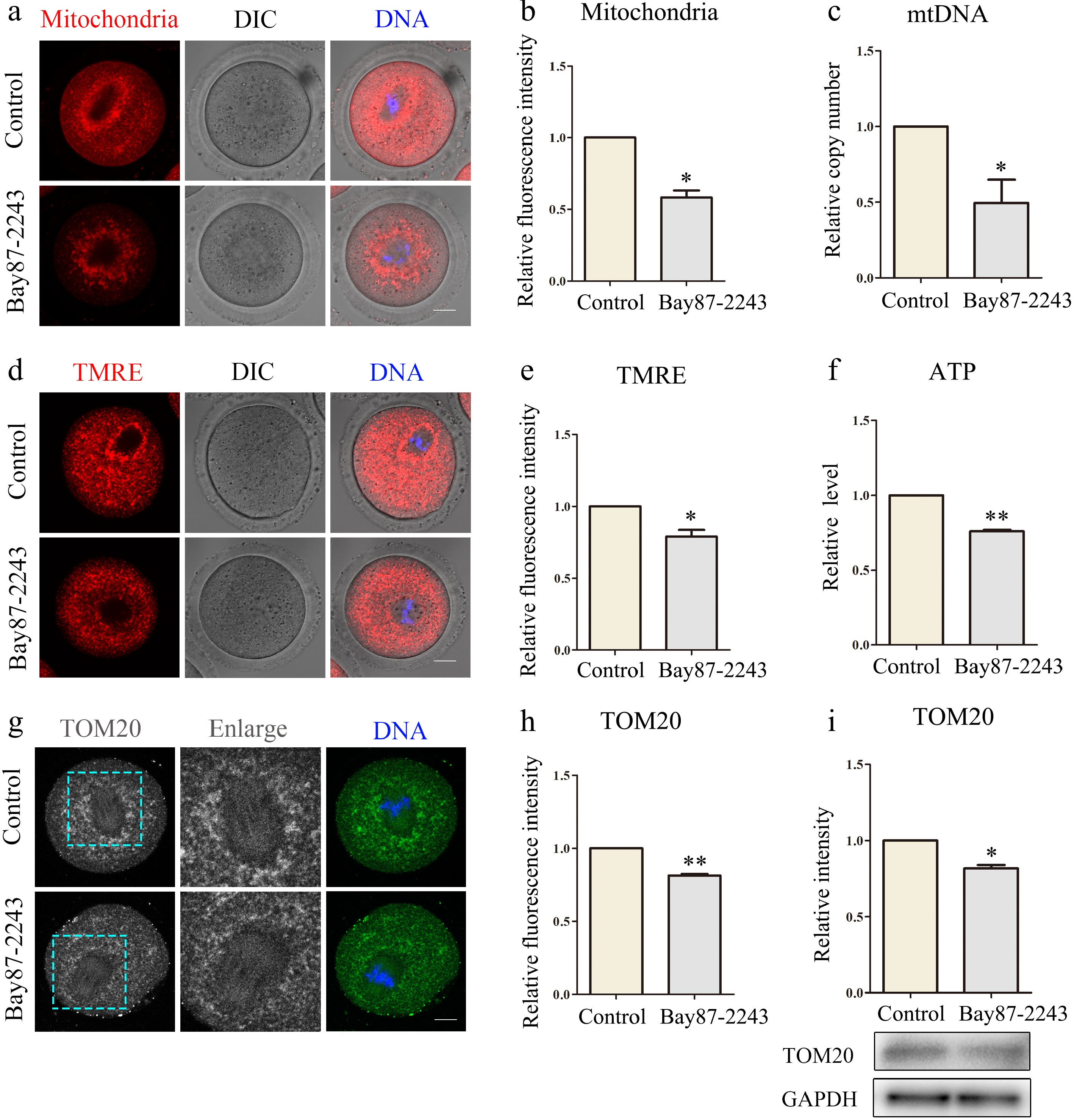 Inhibition of HIF-1α impairs mitochondrial function in oocytes. (a) Typical map of mitochondrial distribution of oocytes in control group and Bay87-2243 treatment group. Red, mitochondria; blue, DNA. Bar = 20 μm. (b) Relative fluorescence intensity of mitochondrial signal after Bay87-2243 treatment. (c) The relative mtDNA copy number was evaluated in both control and Bay87-2243 treatment oocytes. (d) Typical graphs of TMRE in control and Bay87-2243 treatment groups. Red, TMRE; blue, DNA. Bar = 20 μm. (e) Relative fluorescence intensity of TMRE in the control group and Bay87-2243 treatment group. (f) The relative ATP levels were measured in both the control and Bay87-2243 treatment groups. (g) Typical graphs of TOM20 in control and Bay87-2243 treatment groups. Green, TOM20; blue, DNA. Bar = 20 μm. (h) Relative fluorescence intensity of TOM20 in control group and Bay87-2243 treatment group. (i) Western blot was used to detect the expression of TOM20 protein in the control group and Bay87-2243 treatment group. * Significant difference (p < 0.05); ** Significant difference (p < 0.01).