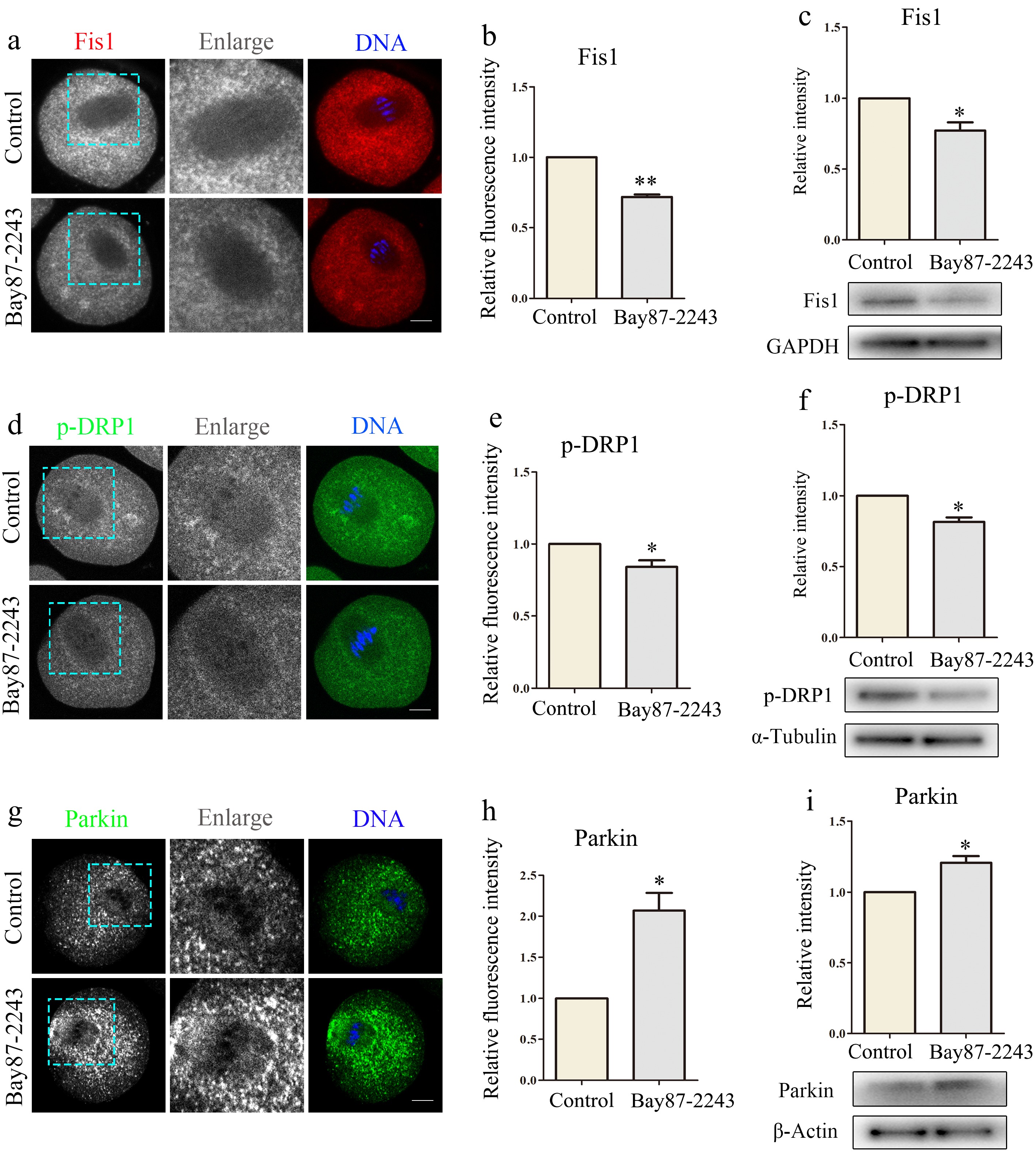 Inhibition of HIF-1α leads to abnormal mitochondrial dynamics in oocytes. (a) Typical graphs of Fis1 in control and Bay87-2243 treatment groups. Red, Fis1; blue, DNA. Bar = 20 μm. (b) Relative fluorescence intensity of Fis1 in control group and Bay87-2243 treatment group. (c) Western blot was used to detect the expression of Fis1 protein in the control group and Bay87-2243 treatment group. (d) Typical graphs of p-Drp1 in control and Bay87-2243 treatment groups. Green, p-Drp1; blue, DNA. Bar = 20 μm. (e) Relative fluorescence intensity of p-Drp1 in control group and Bay87-2243 treatment group. (f) Western blot was used to detect the expression of p-Drp1 protein in the control group and Bay87-2243 treatment group. (g) Typical graphs of Parkin in control and Bay87-2243 treatment groups. Green, Parkin; blue, DNA. Bar = 20 μm. (h) Relative fluorescence intensity of Parkin in control group and Bay87-2243 treatment group. (i) Western blot was used to detect the expression of Parkin protein in the control group and Bay87-2243 treatment group. * Significant difference (p < 0.05); ** Significant difference (p < 0.01).