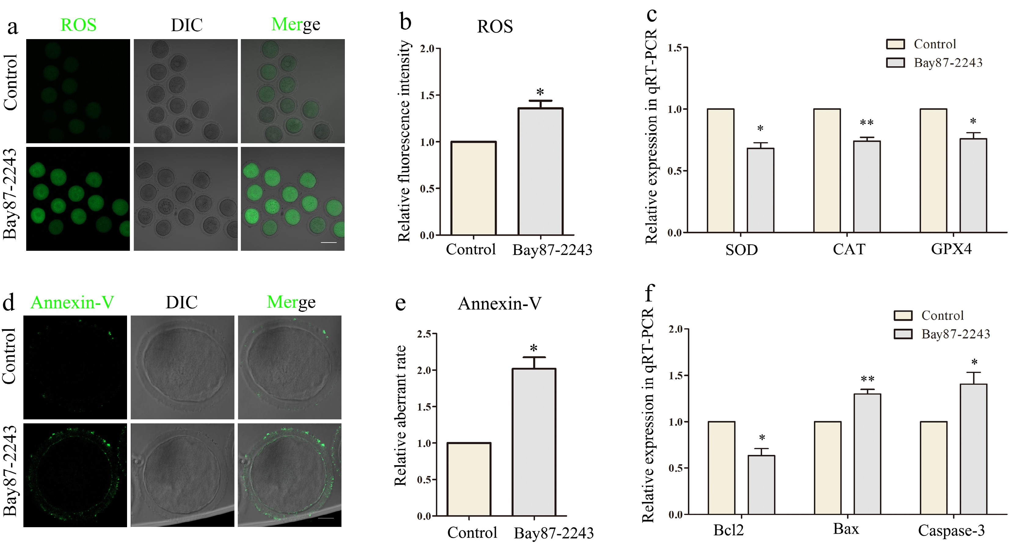 Inhibition of HIF-1α induces oxidative stress and apoptosis of oocytes. (a) The reactive oxygen species (ROS) level in the control and Bay87-2243 treatment groups of oocytes. Green, ROS. Bar = 80 μm. (b) Relative fluorescence intensity of ROS in control group and Bay87-2243 treatment group. (c) Effects of HIF-1α on expression of the several oxidative stress‐related genes in oocytes. The levels of SOD, CAT, and GPX4 expression in the Bay87-2243 treated oocytes decline than the control oocytes. (d) Annexin‐V signals in the control and Bay87-2243 treatment group oocytes. Green, Annexin‐V. Bar = 20 μm. (e) Relative fluorescence intensity of Annexin‐V in control group and Bay87-2243 treatment group. (f) Effect of HIF-1α on the expression of several apoptosis-related genes in oocytes. The expression levels of Bcl2, Bax, and Caspase-3 increased in oocytes treated with Bay87-2243 compared with the control group. * Significant difference (p < 0.05); ** Significant difference (p < 0.01).