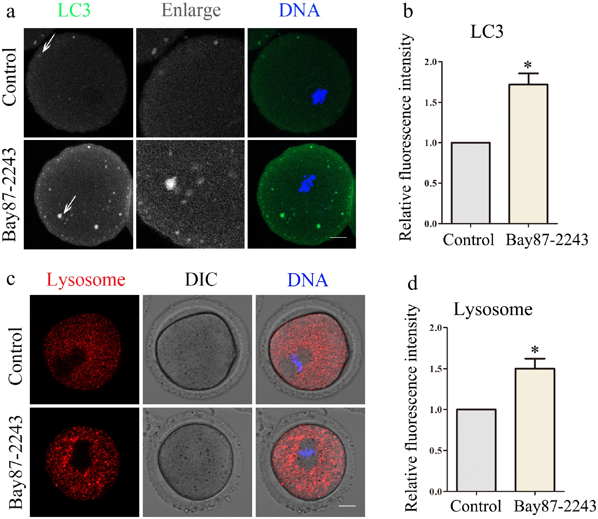 Inhibition of HIF-1α impairs oocyte autophagy and lysosomal function. (a) Typical graphs of LC3 in control and Bay87-2243 treatment groups. Green, LC3; blue, DNA. Bar = 20 μm. (b) Relative fluorescence intensity of LC3 in control group and Bay87-2243 treatment group. (c) Typical graphs of lysosome in control and Bay87-2243 treatment groups. Green, Lysosome; blue, DNA. Bar = 20 μm. (d) Relative fluorescence intensity of lysosome in control group and Bay87-2243 treatment group. * Significant difference (p < 0.05).