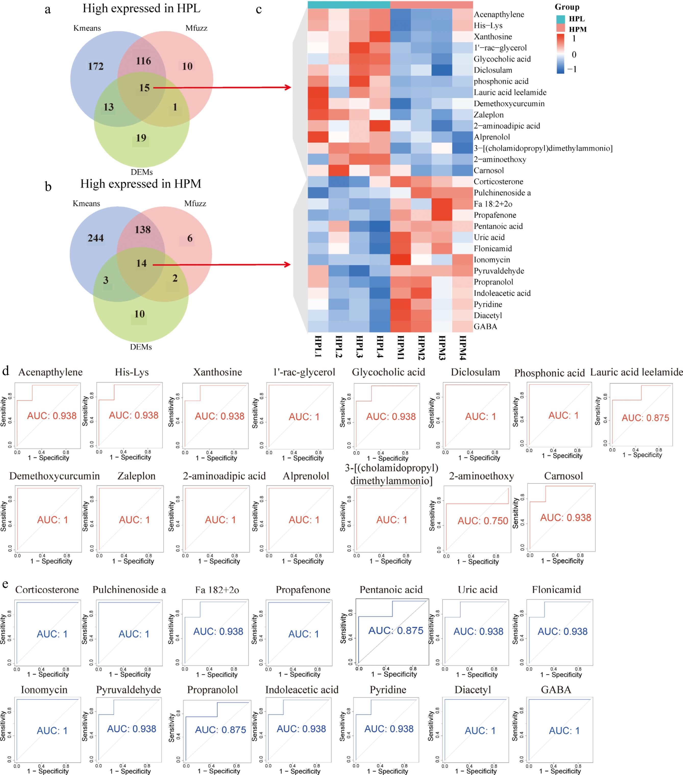 Identification of molecular markers for metabolites associated with aggressive behavior. Metabolite markers in the HP of the (a) most and (b) least aggressive behavior identified by combining different data processing methods (kmeans, Mfuzz, and DEMs). (c) Heatmap of the expression levels of metabolic markers related to aggressive behavior in the HP. (d) and (e) The Receiver Operating Characteristic (ROC) curves for these candidate metabolic markers.