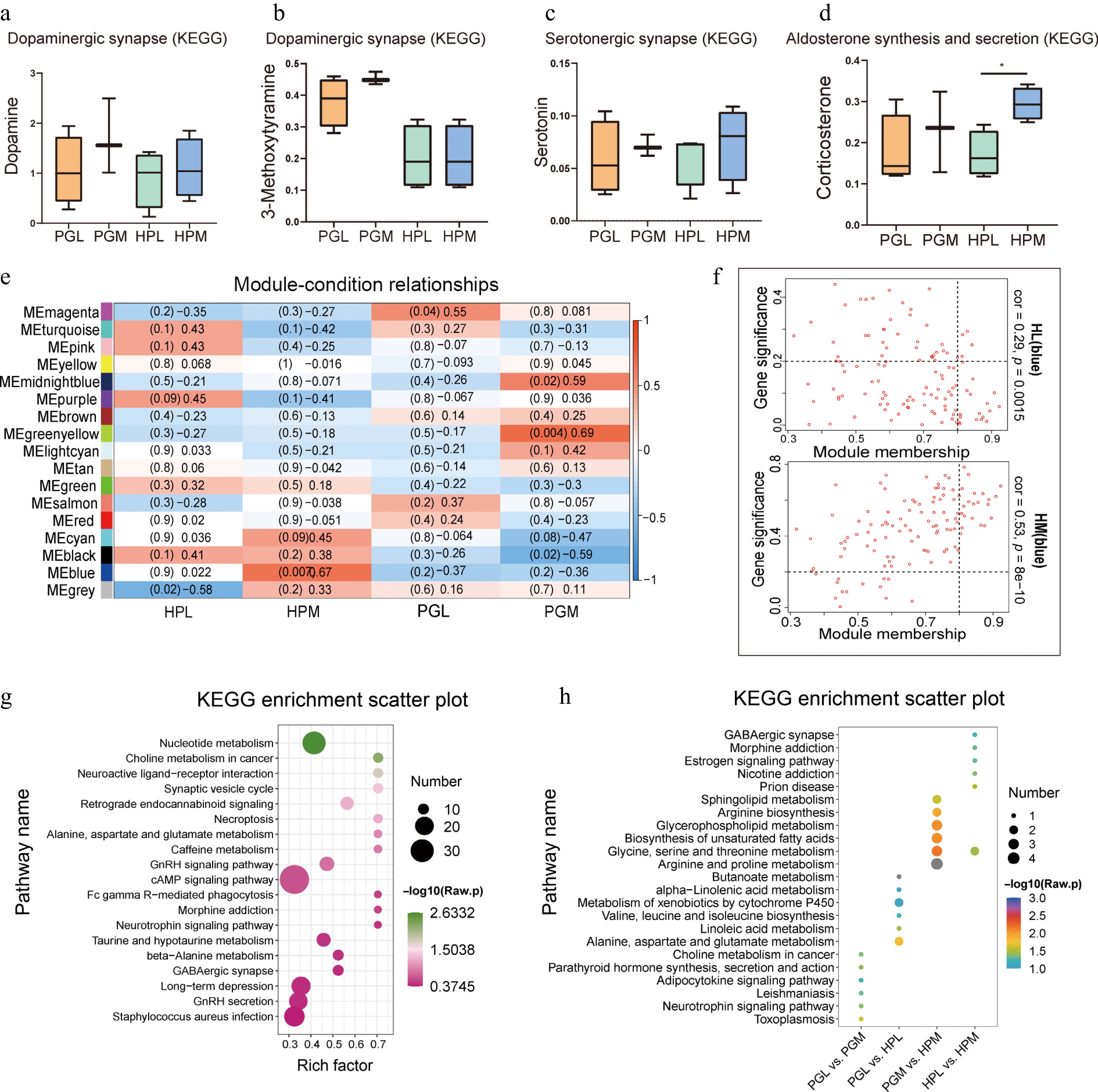 Functional enrichment analysis of identified metabolites. (a) - (d) represent the relative expression of dopamine, 3-methoxytyamine, serotonin, and corticosterone in the hypothalamus (HP) and pituitary gland (PG) of pigs exhibiting varying degrees of aggression. Notably, a significant difference was observed in the relative expression of corticosterone between the least aggressive pigs (HPL) and the most aggressive pigs (HPM), denoted by an asterisk indicating p < 0.05. (e) Weighted Gene Co-expression Network Analysis (WGCNA) of metabolites in HP and PG of pigs with different aggressive behaviors. (f) Metabolites in the MEblue module were negatively correlated with HPL and positively correlated with HPM. (g) Kyoto Encyclopedia of Genes and Genomes (KEGG) enrichment plot of metabolites in the MEblue module. (h) KEGG enrichment plot of differentially expressed metabolites (DEMs) in tissues (PGL vs HPL, PGM vs HPM) and aggression (PGL vs PGM, HPL vs HPM), showcasing the pathways in which these DEMs are involved.