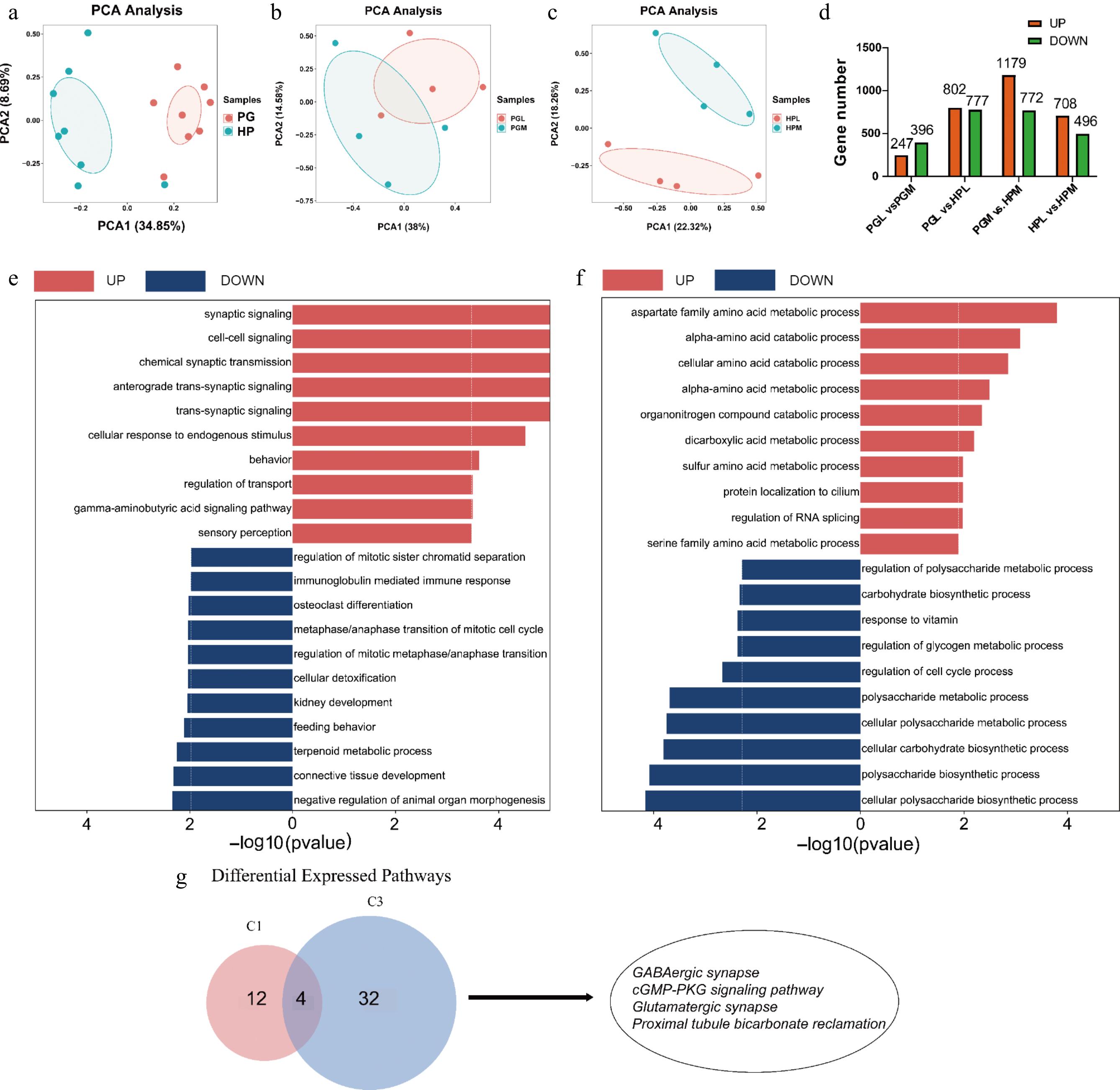 Transcriptomic profiles of the hypothalamus (HP) and pituitary gland (PG) in the most and least aggressive pigs. (a)−(c) are PCA analyses of genes identified from different tissues (HP vs PG) and aggression (PGL vs PGM, HPL vs HPM). (d) Number of DEGs (fold change > 2 or < 0.5 and p-value < 0.05) identified in different tissues (PGL vs HPL, PGM vs HPM) and aggression (PGL vs PGM, HPL vs PGM). (e) and (f) represent GO enrichment analysis of DEGs for PG (PGL vs PGM) and HP (HPL vs HPM), respectively, where red entries indicate genes up-regulated in the most aggressive compared to least aggressive pigs, and blue indicates down-regulated genes. (g) The Venn plot demonstrates the KEGG pathway that is generally upregulated in the most aggressive pigs, C1 represents the pathway enriched in PGM, and C3 represents the pathway enriched in HPM, including GABAergic synapses, cGMP-PKG signaling, glutamatergic synapses, and proximal tubular carbonic acid synapses were consistently upregulated in both HPM and PGM groups.