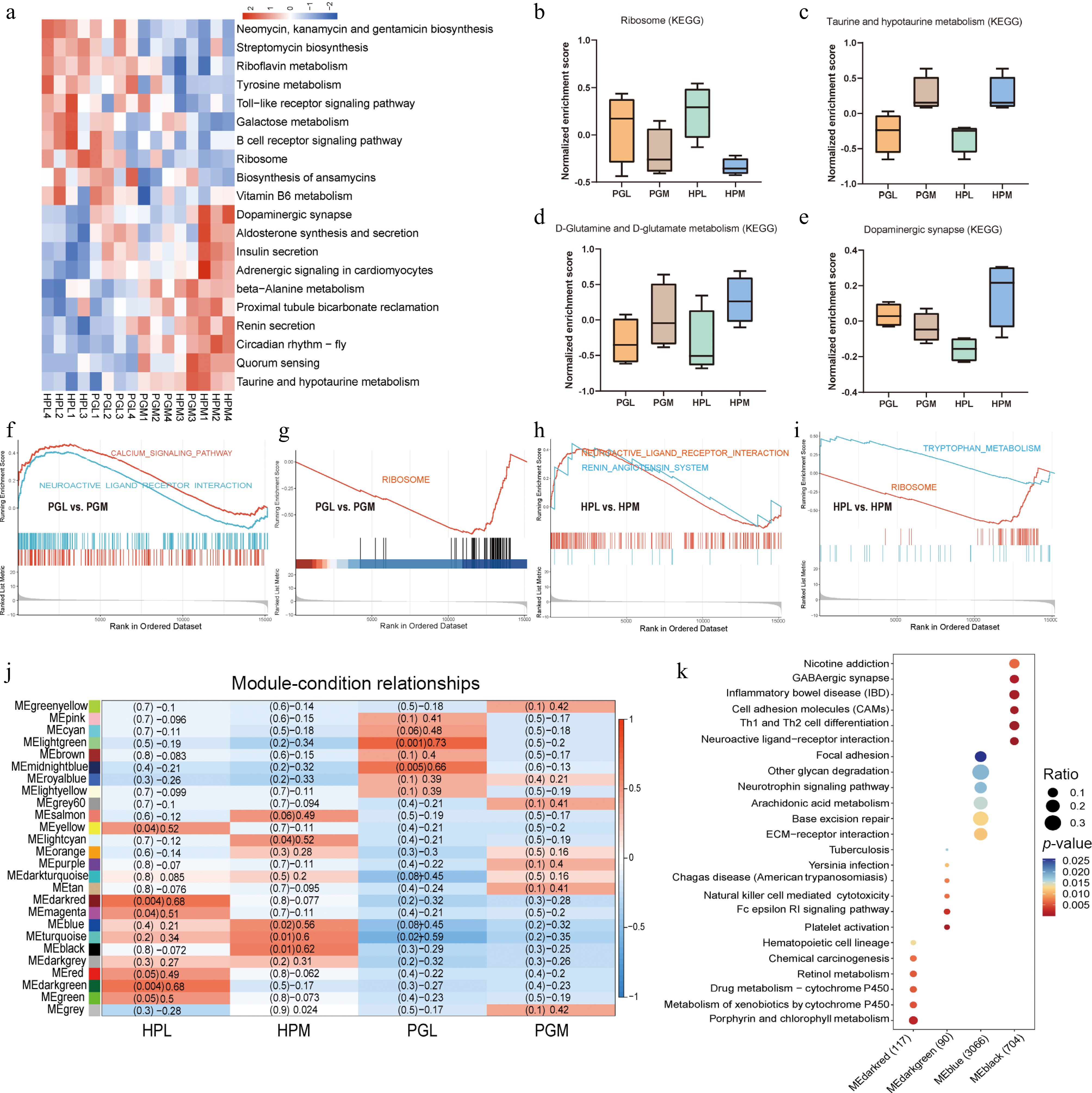 Transcriptomic functional enrichment analysis. (a) The clustered heatmap represents the relationship between pathways of gene set variation analysis (GSVA) and aggressive behavior. (b)−(e) Box plots showing the GSVA normalized enrichment scores for 'Ribosome', 'Taurine and hypotaurine metabolism', 'D-glutamine and D-glutamate metabolism', and 'Dopaminergic synapse', respectively. (f)−(i) show the pathways in the gene set enrichment analysis (GSEA) related to aggressive behavior (PGL vs PGM, HPL vs HPM). (j) WGCNA analysis of genes in HP and PG of pigs with different aggressive behaviors. (k) KEGG enrichment pathway of MEdarkred (gene set: 117), MEdarkgreen (gene set: 90), MEblue (gene set: 3066), and MEblack (gene set, 704) modules.
