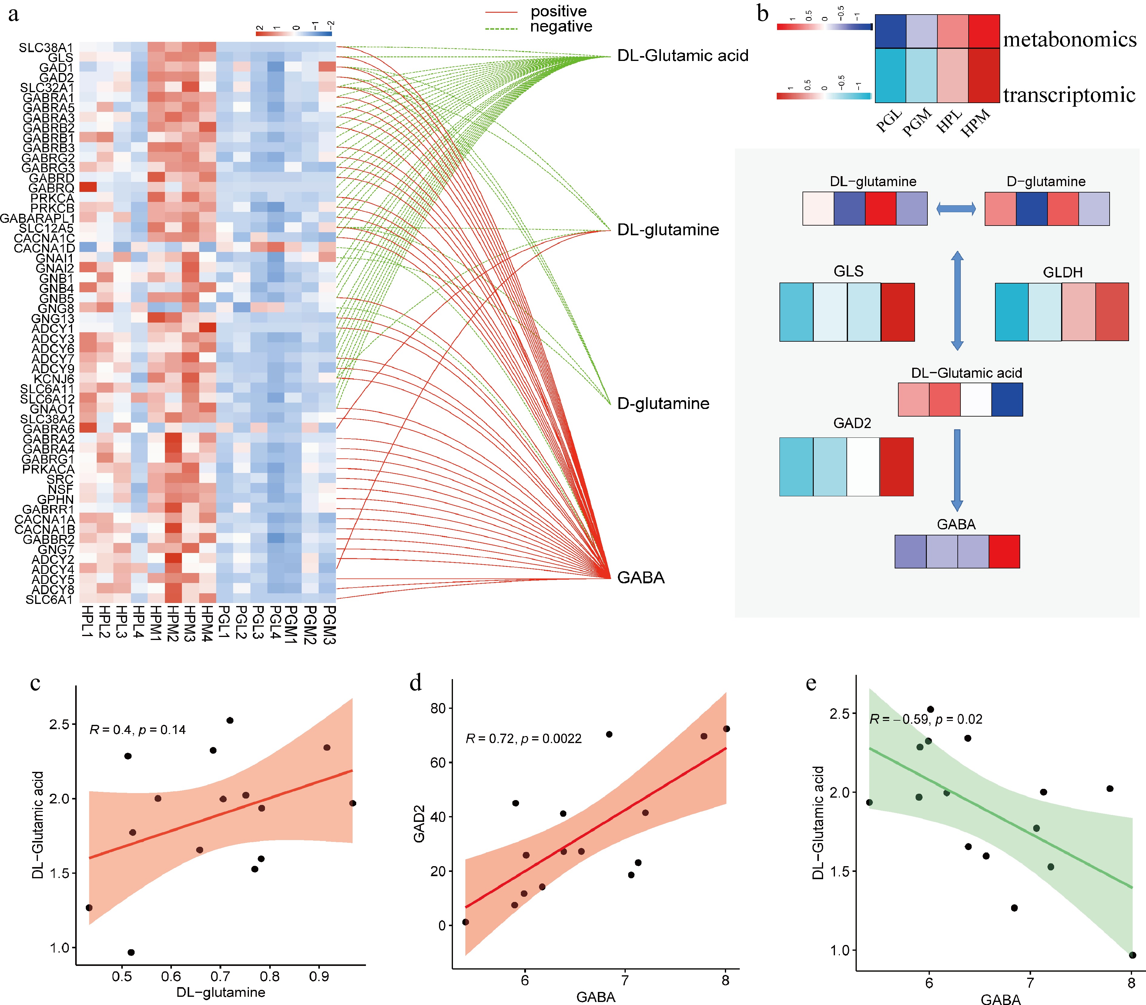 Integrated analysis of metabolome and transcriptome. (a) Correlation analysis of GABA-related genes and GABA-related metabolites, with a threshold of the absolute value of the correlation coefficient > 0.5 (positive means r is greater than 0.5, and negative means r is less than −0.5) and p < 0.05. (b) Heatmap showing transcription and metabolism associated with GABA synthesis in PGL, PGM, HPL, and HPM groups. (c)−(e) Represent the relationships between DL-glutamine and DL-glutamic acid (R = 0.4, p = 0.14), GABA and GAD2 (R = 0.72, p = 0.0022), and GABA and DL-glutamic acid (R = 0.59, p = 0.02), respectively.