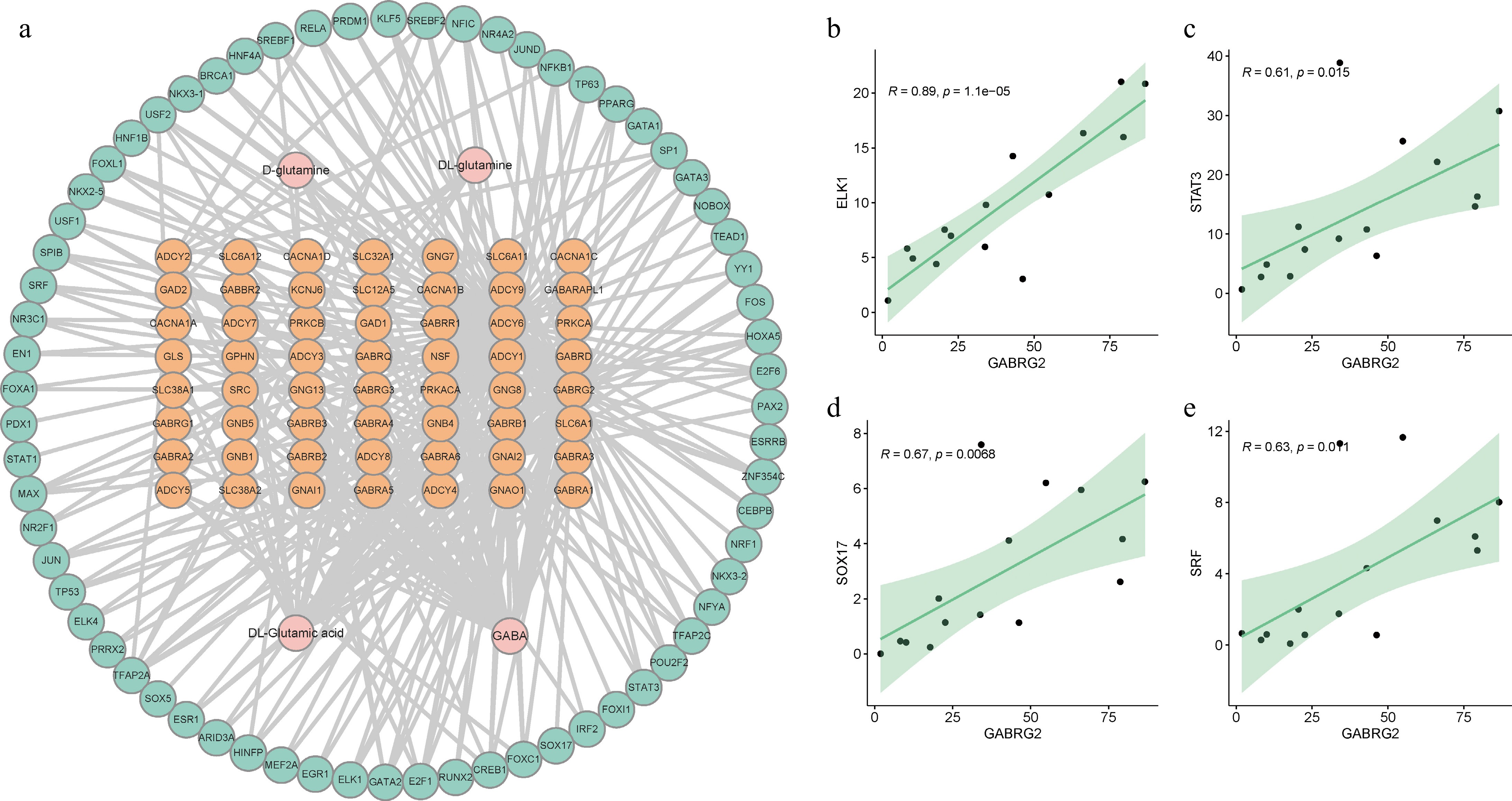 Interaction network for GABA-related genes, transcription factors, and metabolites. (a) A comprehensive network of 273 regulatory pairs including interactions between GABA-related genes, transcription factors, and metabolites. (b)−(e) The correlation between the expression levels of specific transcription factors and the GABRG2 gene. Each panel shows the relative expression correlation for one of the transcription factors (ELK1, STAT3, SOX17, and SRF) with GABRG2, respectively.