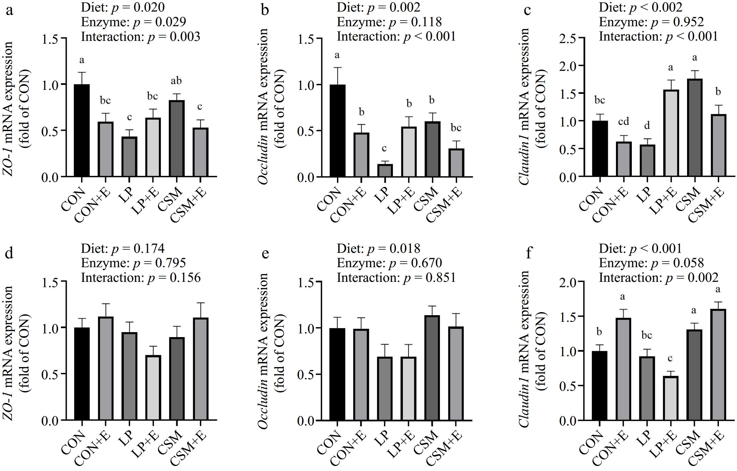Dietary type and enzyme preparation had significant interaction on claudin1 in 86 d jejunum of Langshan chickens. Compared with CON group, CON + E, CSM, and CSM + E groups could significantly increase the expression level of claudin1 gene in jejunum of Langshan chickens (p < 0.01), the LP + E group could significantly decrease the expression level of claudin1 gene in jejunum of Langshan chickens (p < 0.01).