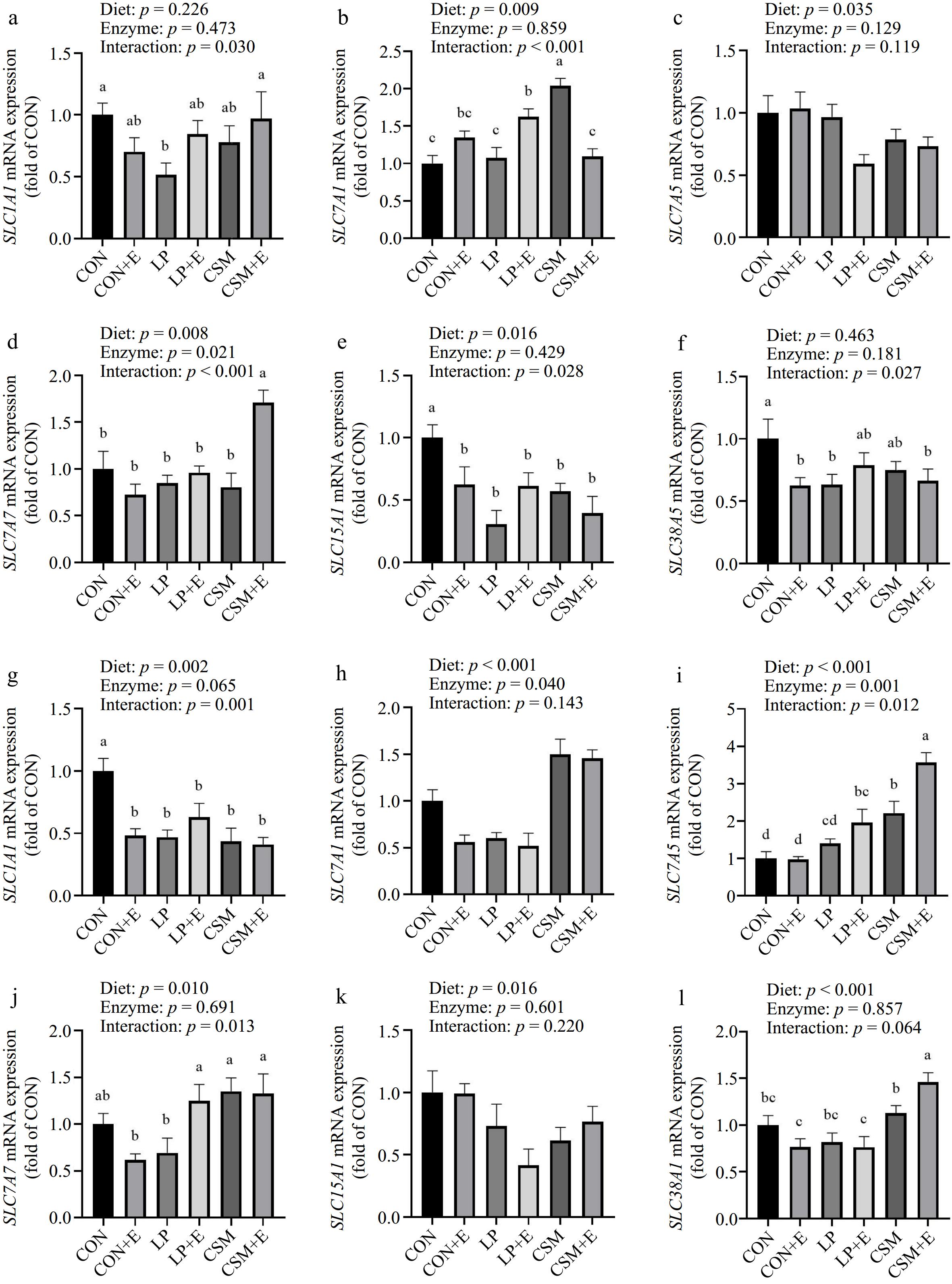 The expression levels of amino acid transporter genes SLC1A1, SLC7A5 and SLC7A7 in 86 d jejunum of Langshan chickens were influenced by dietary type and complex enzyme. Compared with CON, CSM + E, LP, LP + E, CSM, and CSM + E significantly down-regulated SLC1A1 gene expression in jejunum of Langshan chickens (p < 0.01), LP + E, CSM, and CSM + E significantly increased SLC7A5 gene expression (p < 0.05). CON + E, and LP significantly offset SLC7A7 gene expression (p < 0.05).
