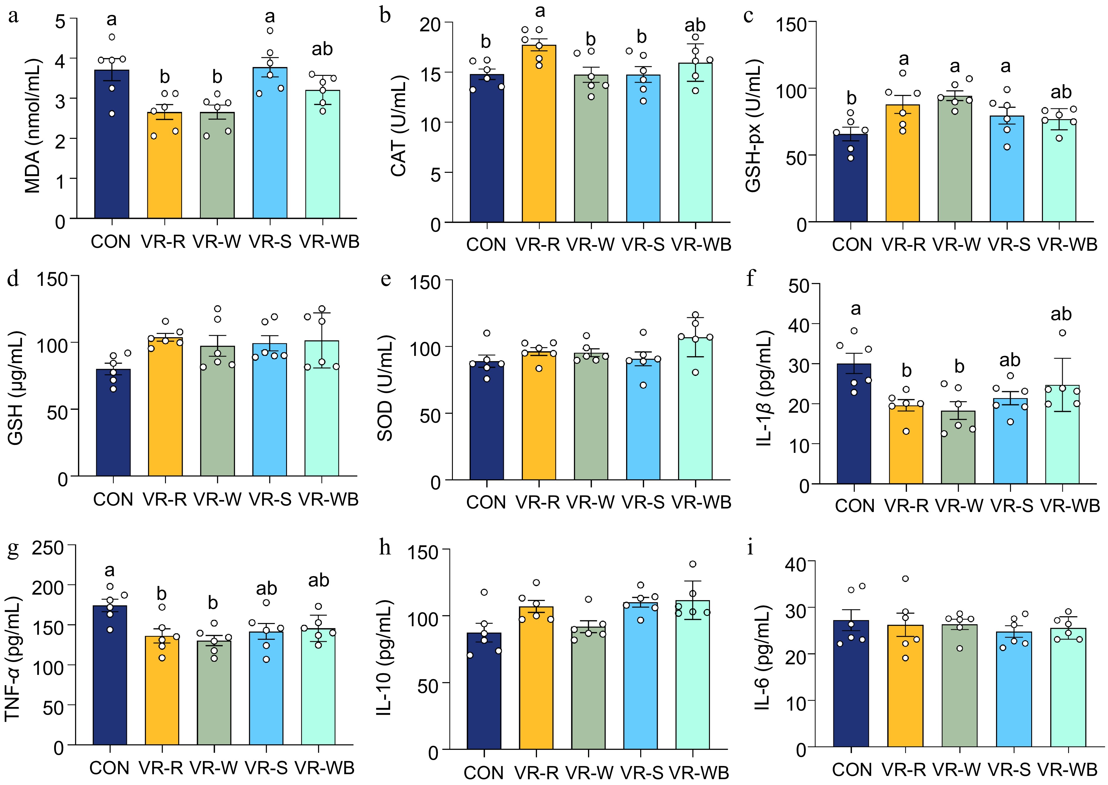 Plasma antioxidative enzyme activities and cytokines of growing pigs fed diets based on different sources of VR. (a)−(d) The plasma activities of MDA, CAT, GSH-px, GSH, and SOD. (f)−(i) The plasma levels of IL-1β, TNF-α, IL-10, and IL-6 values are means ± SEMs, n = 6. Labelled means without a common letter are significantly different from each other, p < 0.05.