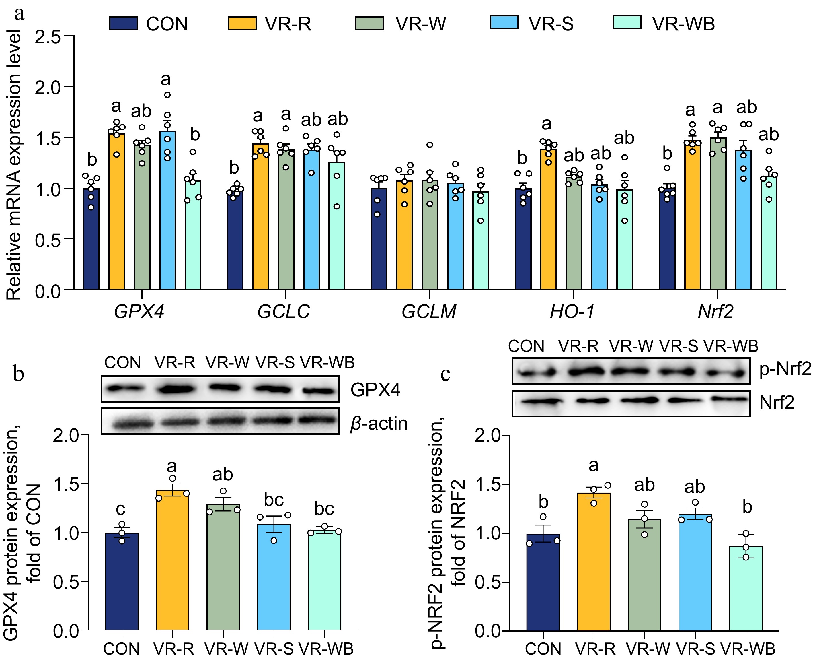 Effects of VR on the intestinal oxidative stress related to Nrf2 pathways. (a) Relative mRNA expressions of GPX4, GCLC, GCLM, HO-1, and Nrf2 normalized to β-actin expression. (b), (c) Western blot analysis of GPX4 and p-Nrf2 protein levels normalized to β-actin or Nrf2. Values are means ± SEMs, n = 3 or 6. Labelled means without a common letter are significantly different from each other, p < 0.05.