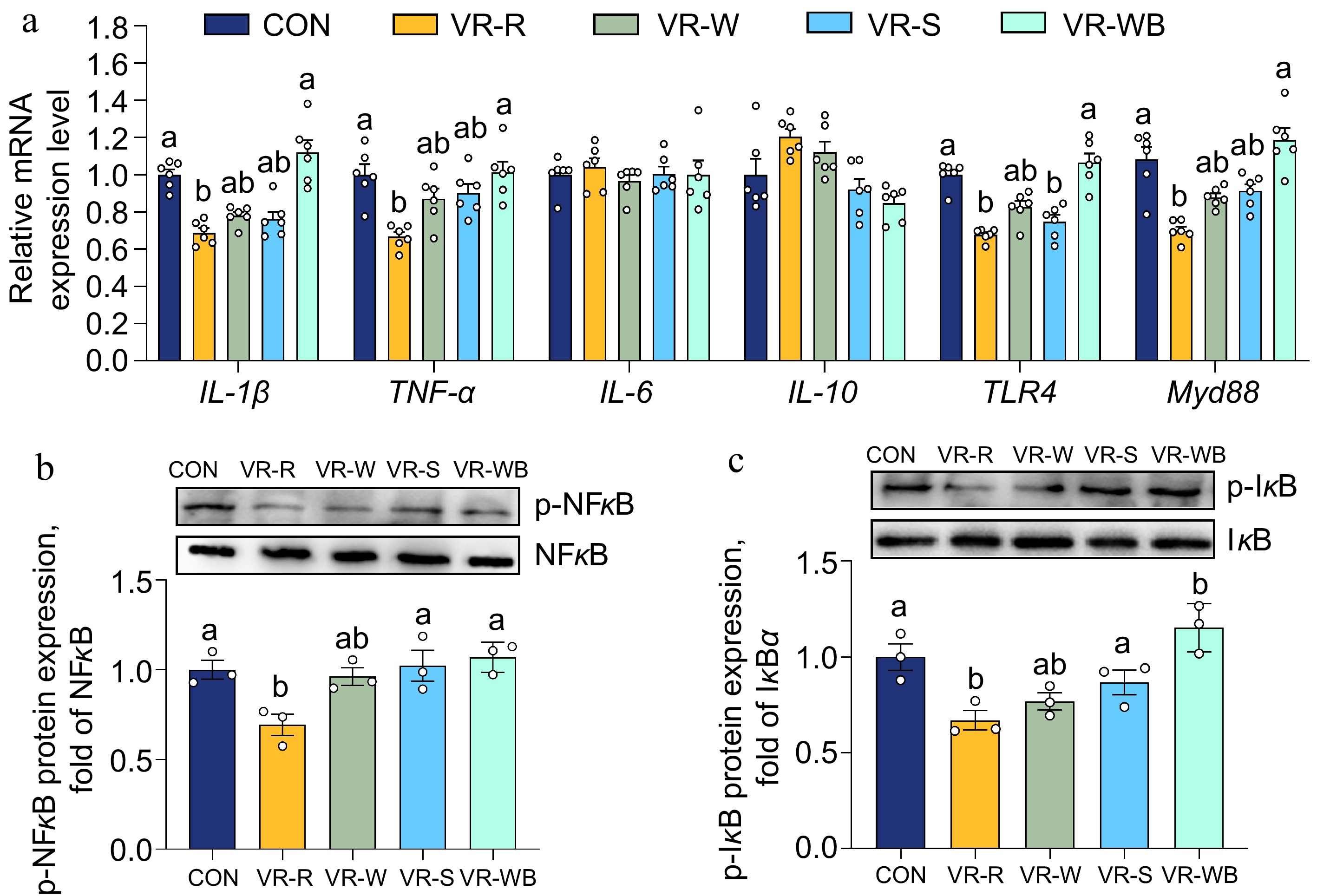 Effects of VR on the intestinal inflammatory response related to NF-κB pathways. (a) Relative mRNA expressions of IL-1β, TNF-α, IL-6, IL-10, TLR4, and Myd88 normalized to β-actin expression. (b), (c) Western blot analysis of p-NFκB and p-IκB protein levels normalized to NFκB or IκB. Values are means ± SEMs, n = 3 or 6. Labelled means without a common letter are significantly different from each other, p < 0.05.