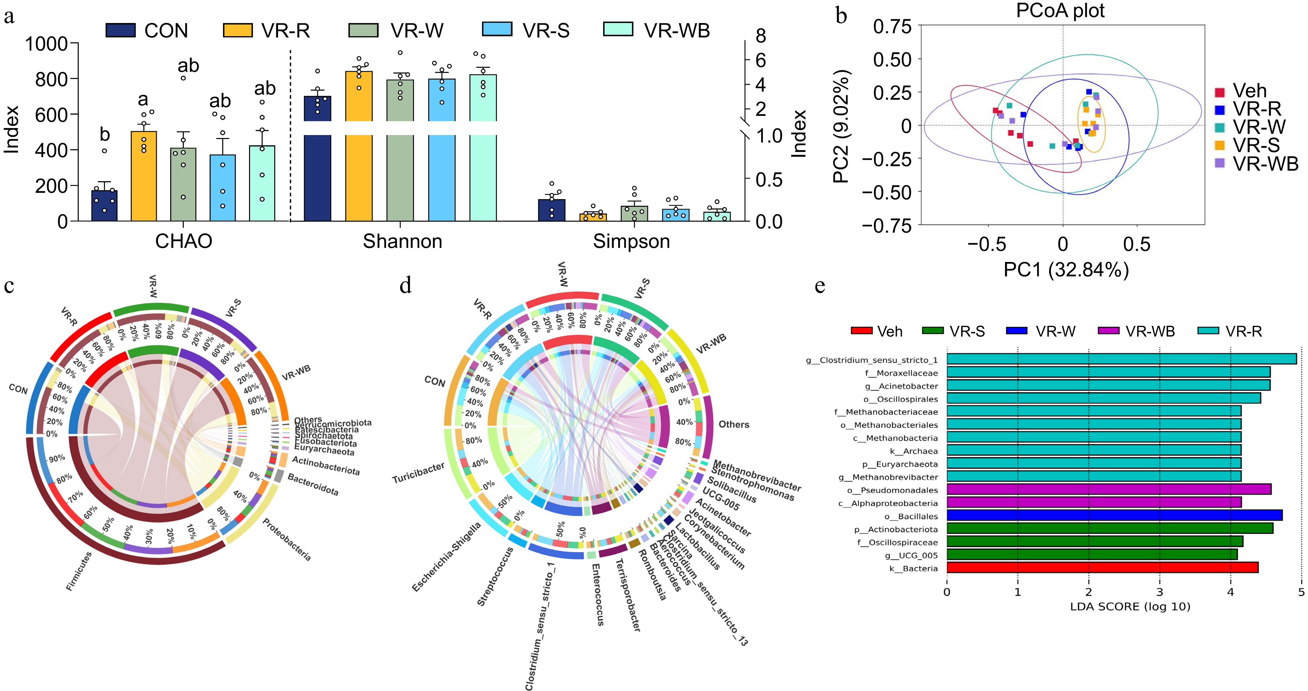 Effects of VR on the intestinal bacterial composition and diversity. (a) The diversity of CHAO, Shannon Simpson. (b) PCoA analysis. (c), (d) The community structure of each group was analyzed at the phylum level and genus level. (e) Distribution histogram of different bacteria based on LDA score. Values are means ± SEMs, n = 6. Labeled means without a common letter are significantly different from each other, p < 0.05.