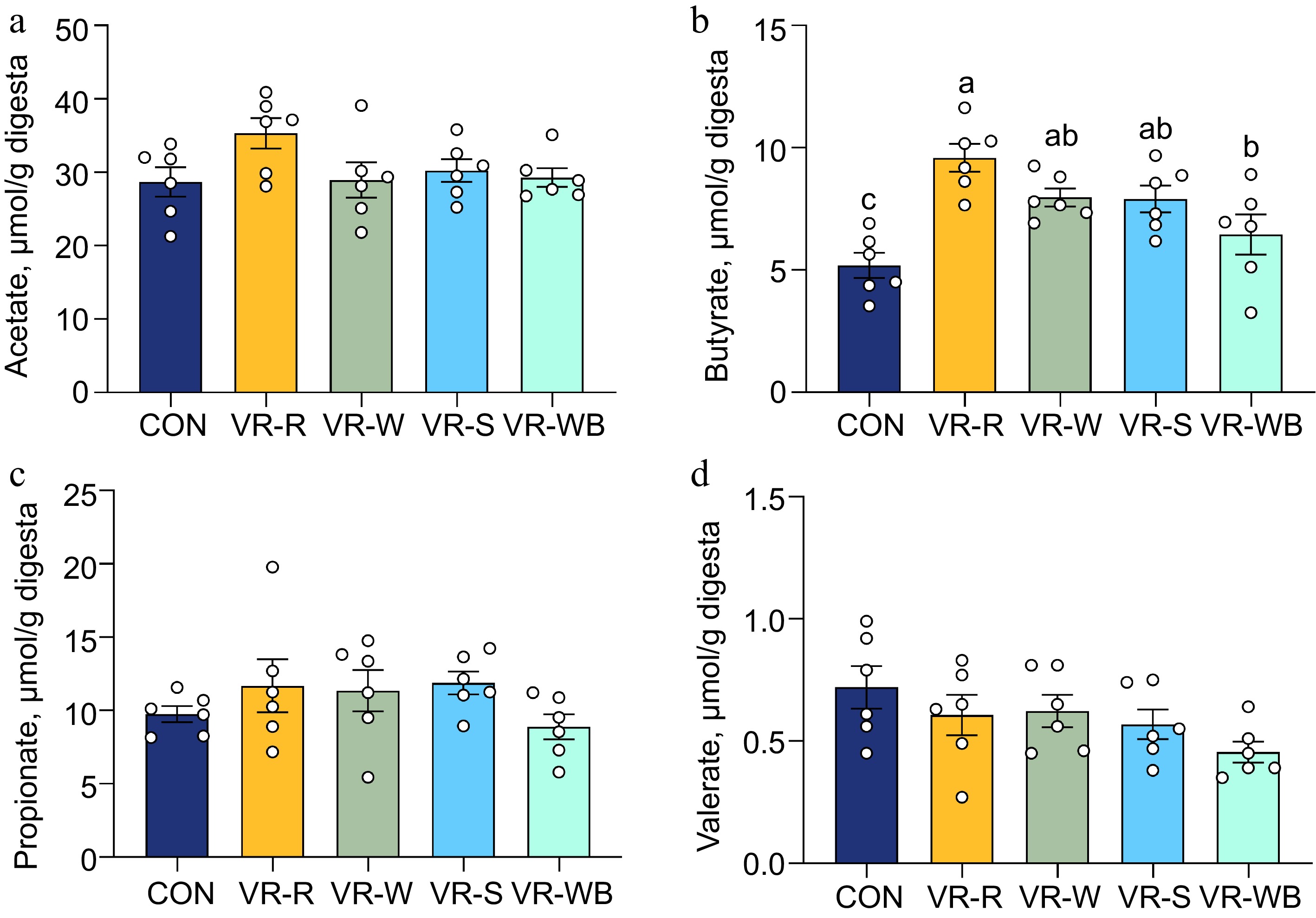 Effects of VR on the intestinal bacterial composition and diversity. (a)−(d) concentrations of acetate, butyrate, propionate, and valerate. Values are means ± SEMs, n = 6. Labeled means without a common letter are significantly different from each other, p < 0.05.