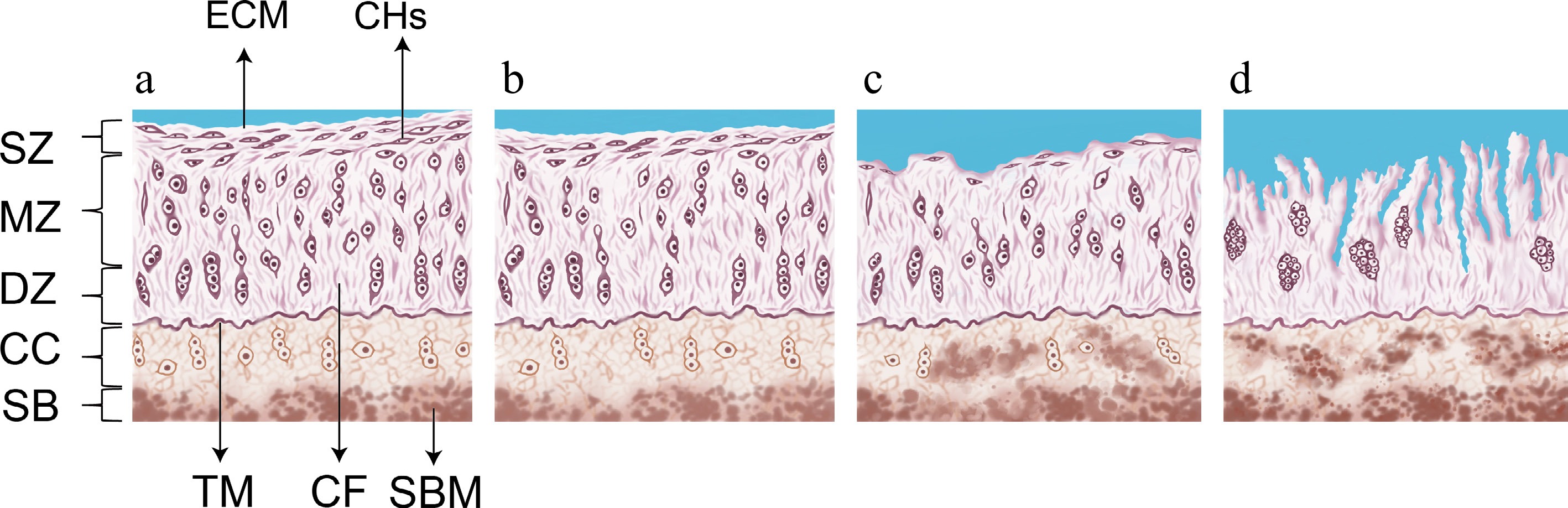 Schematic diagram of the progression of articular cartilage degeneration. (a) Healthy joint cartilage. (b) Stage 0 to 1 of articular cartilage degeneration. (c) Stage 2 of articular cartilage degeneration. (d) Stage 3 of articular cartilage degeneration. ECM, extracellular matrix; CHs, chondrocytes; TM, tidemark; CF, collagen fibres; SBM, subchondralbone marrow; SZ, superficial zone; MZ, middle zone; DZ, deep zone; CC, calcified cartilage; SB, subchondral bone. Note: This figure was illustrated by Yatong Yang, one of the authors of this review. The histological evaluation criteria depicted were adapted from the concepts described in Vincent & Wann[38], with context-specific modifications introduced in this study.