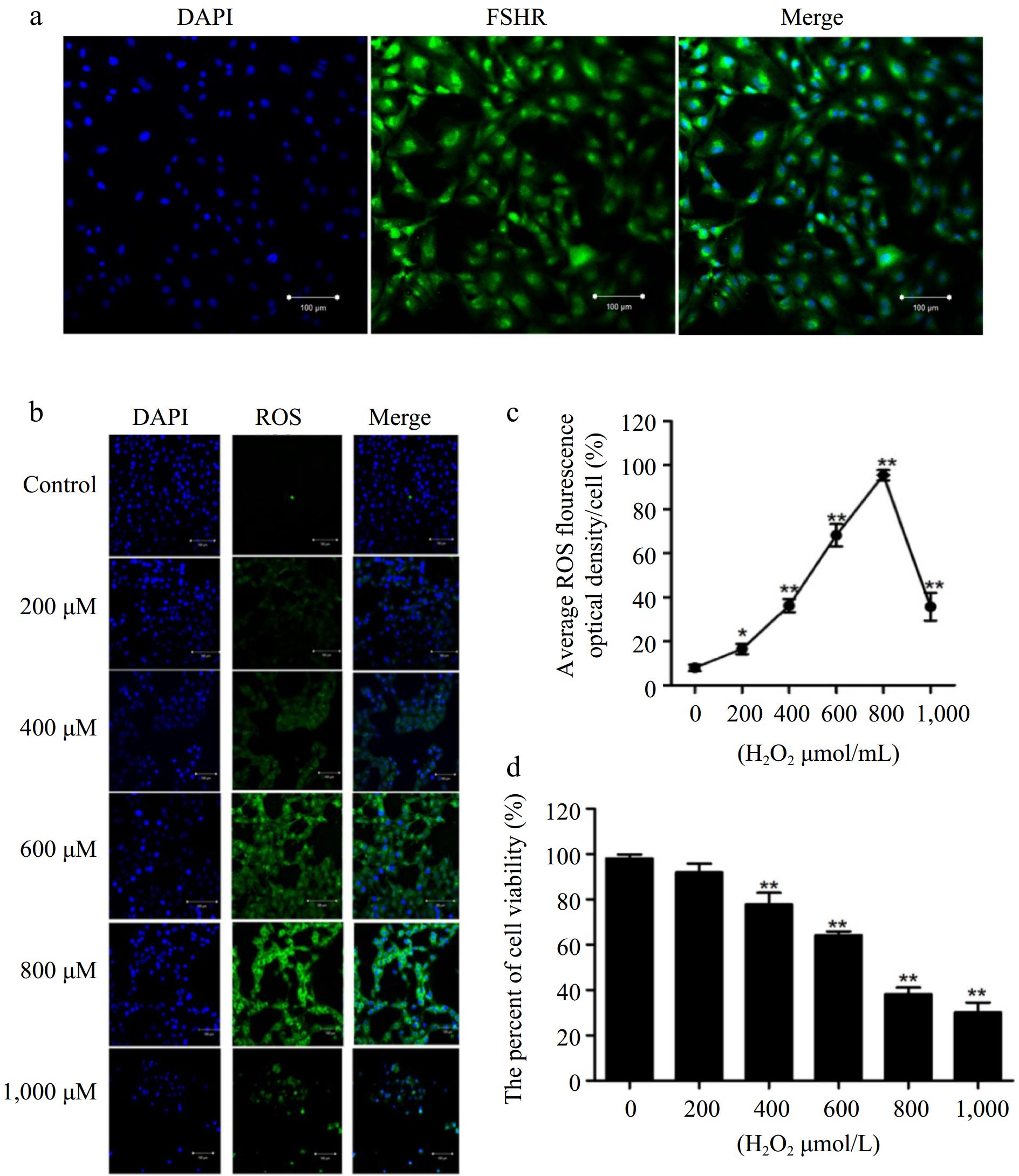 Establishment of oxidative stress model in BGCs. (a) The BGCs were cultured in vitro and identified by immunofluorescence against FSHR. (b) Immunofluorescence labelling of ROS in the BGCs. (c) Quantification of intracellular ROS levels. (d) Cell viability of BGCs after exposure to H2O2 (0 to 1,000 μM) for 2 h. Data are expressed as mean ± SEM, n = 3. * p < 0.05, and ** p < 0.001. Scale bar, 100 μm.