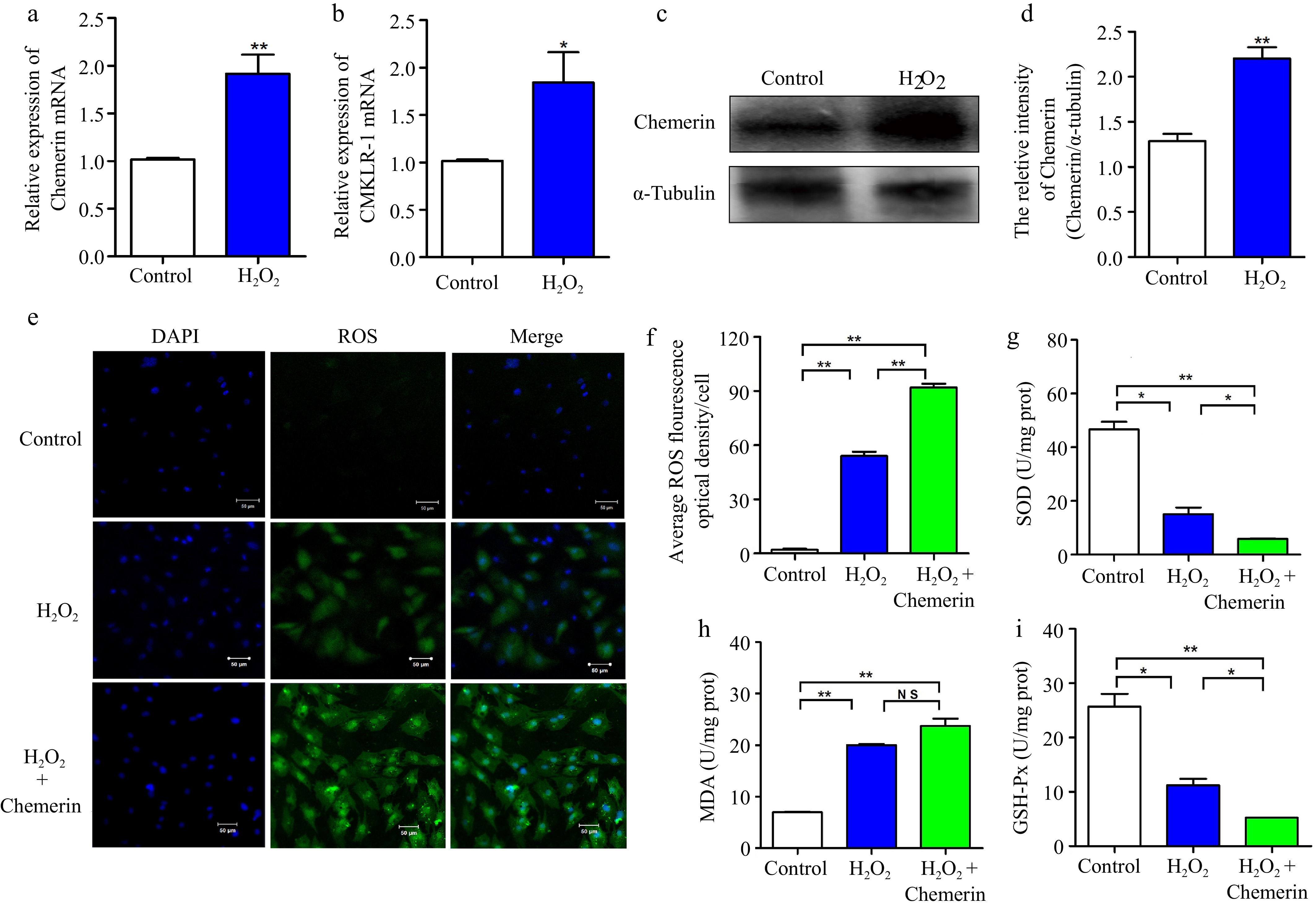 Chemerin promotes oxidative stress in BGCs. (a), (b) Detection mRNA expressions of chemerin and CMKLR-1 after H2O2 treatment in BGCs by RT-qPCR. (c), (d) Detection protein expression of chemerin in BGCs by western blotting. α-Tubulin was used as the internal control for protein level normalization. (e) DCFH-DA assay for detection ROS content in BGCs exposed to H2O2 with or without chemerin. (f) Relative fluorescence intensity of ROS. (g)−(i) Effect of chemerin on the antioxidant enzymes in H2O2-induced BGCs. Data are expressed as mean ± SEM, n = 3. * p < 0.05, and ** p < 0.001, ns denotes not significant. Scale bar, 50 μm.