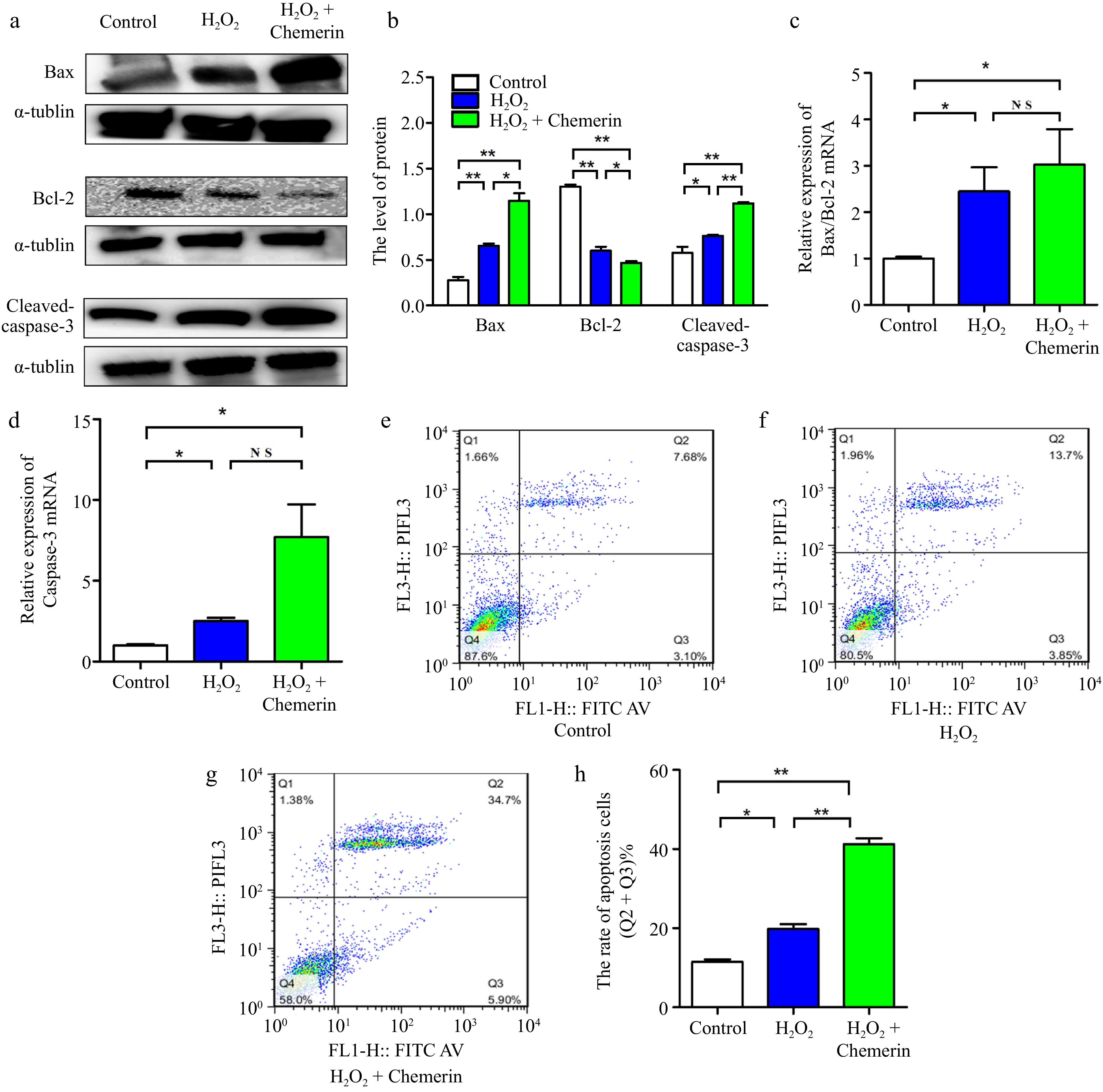 It has been shown that elevated levels of oxidative stress induce apoptosis[20]. As depicted in Fig. 3a, b, H2O2 exposure significantly increased the levels of pro-apoptotic proteins (Bax and Cleaved-caspase-3) and decreased the expression of the anti-apoptotic protein (Bcl-2) in comparison to the control group, and chemerin treatment enhanced the apoptosis. Consistently, compared to the control, the combination of H2O2 and chemerin remarkably increased the mRNA expression of Caspase-3 and Bax/Bcl-2 (Fig. 3c, d). To further assess the impact of chemerin on apoptosis, flow cytometry was employed to measure the apoptosis rate. As depicted in Fig. 3e−h, compared with the control, H2O2 treatment significantly increased the apoptosis rate (19.5%), and the apoptosis rate was further increased in the H2O2 and chemerin co-treated group (42%). In conclusion, our findings suggested that chemerin enhanced H2O2-induced apoptosis.